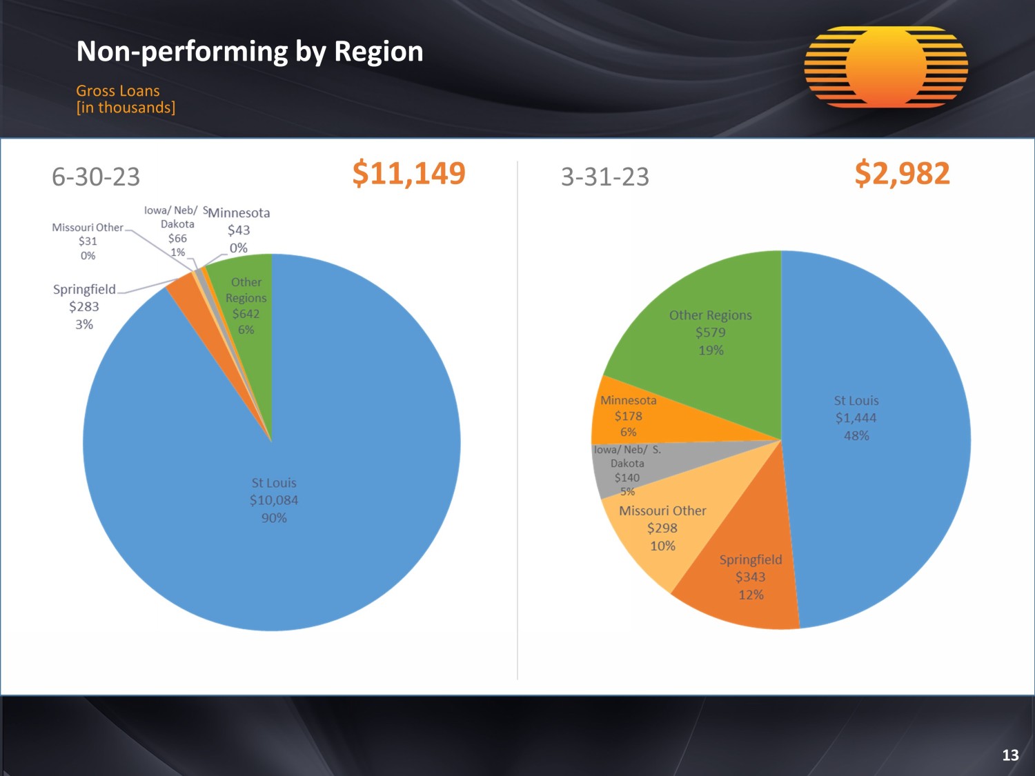 Non - performing by Region Gross Loans [in thousands] 13 6 - 30 - 23 $11,149 3 - 31 - 23 $2,982