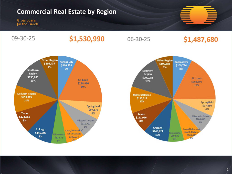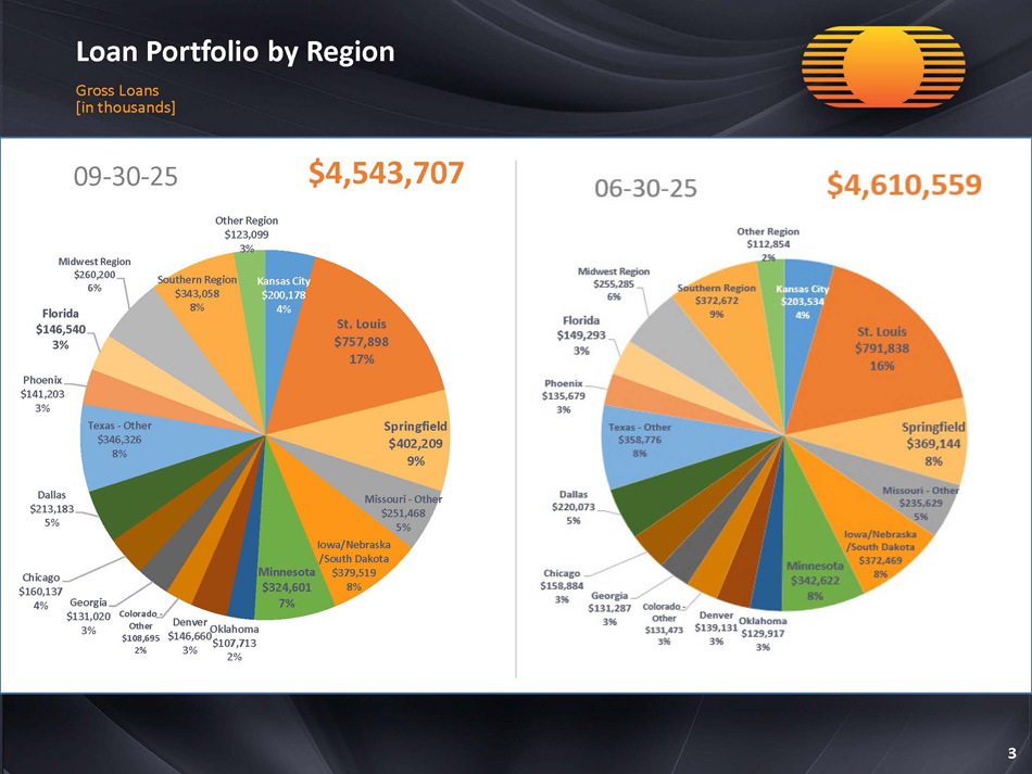 Loan Portfolio by Region Gross Loans [in thousands] Kansas City $200,178 4% St. Louis $757,898 17% Springfield $402,209 9% 8% Missouri - Other $251,468 5% Iowa/Nebraska /South Dakota Minnesota $379,519 $324,601 7% Oklahoma 2% Denver Other $108,695 $146,660 $107,713 2% 3% Georgia $131,020 Colorado - 3% Chicago $160,137 4% Dallas $213,183 5% Texas - Other $346,326 8% Phoenix $141,203 3% Florida $146,540 3% Midwest Region $260,200 6% Southern Region $343,058 8% Other Region $123,099 3% 09 - 30 - 25 $4,543,707 3