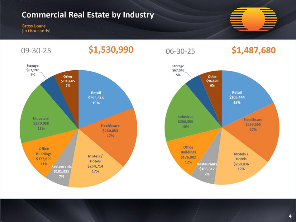 Commercial Real Estate by Industry Gross Loans [in thousands] Retail $293,816 19% Healthcare $260,053 17% Motels / Hotels $254,714 17% Restaurants $101,825 7% Office Buildings $177,692 11% Industrial $270,088 18% Storage $67,197 4% Other $105,605 7% 09 - 30 - 25 $1,530,990 4