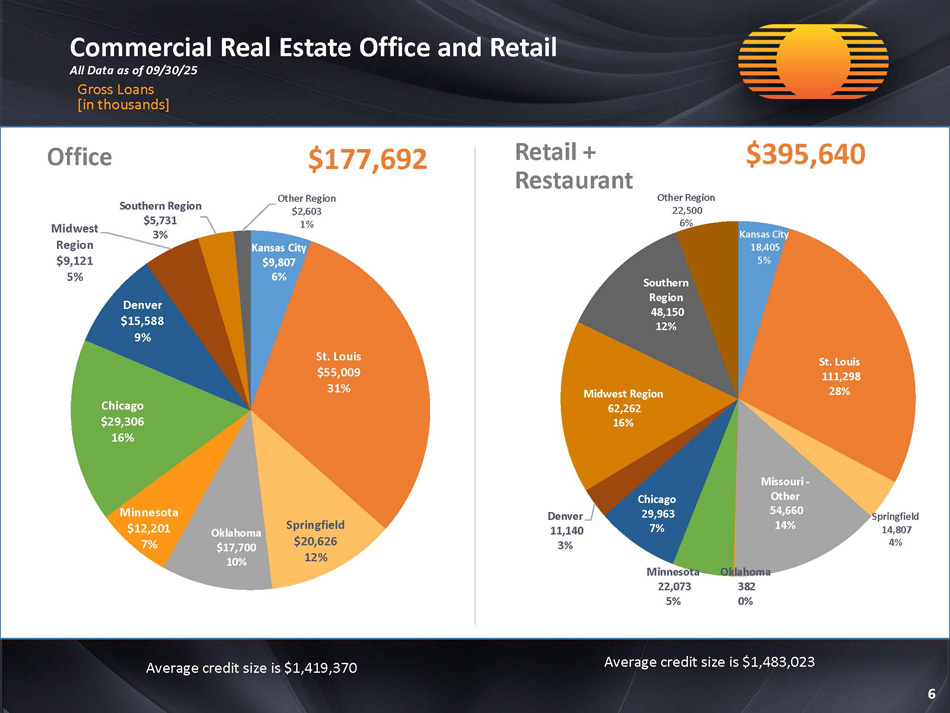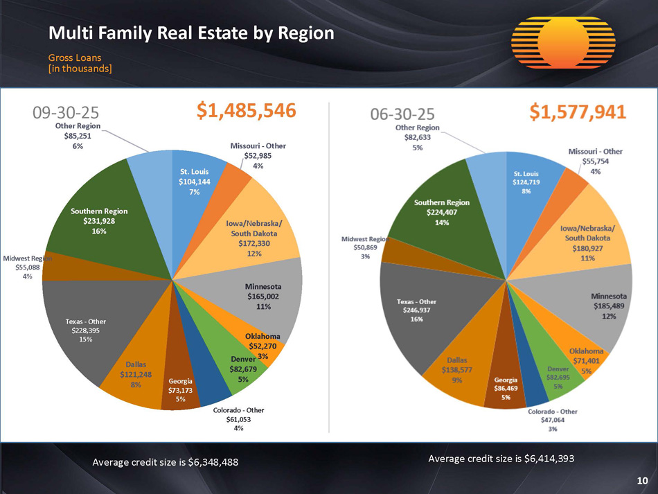 Multi Family Real Estate by Region Gross Loans [in thousands] St. Louis $104,144 7% Missouri - Other $52,985 4% Iowa/Nebraska/ South Dakota $172,330 12% Minnesota $165,002 11% Oklahoma $52,270 Denver 3% $82,679 5% Colorado - Other $61,053 4% Georgia $73,173 5% Dallas $121,248 8% Texas - Other $228,395 15% Midwest Region $55,088 4% Southern Region $231,928 16% 09 - 30 - 25 Other Region $85,251 6% $1,485,546 Average credit size is $6,348,488 Average credit size is $6,414,393 10