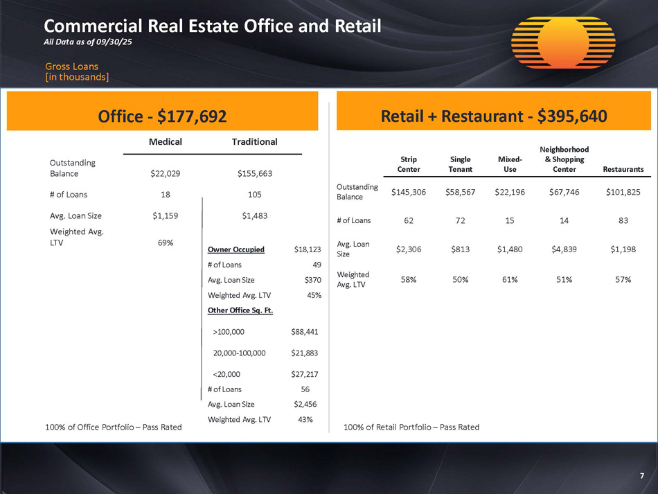 Commercial Real Estate Office and Retail All Data as of 09/30/25 Gross Loans [in thousands] Kansas City $9,807 6% St. Louis $55,009 31% Springfield $20,626 12% Oklahoma $17,700 10% Minnesota $12,201 7% Chicago $29,306 16% Denver $15,588 9% Midwest Region $9,121 5% Southern Region $5,731 3% Kansas City 18,405 5% 6 St. Louis 111,298 28% Springfield 14,807 4% Missouri - Other 54,660 14% Oklahoma 382 0% Minnesota 22,073 5% Chicago 29,963 7% Denver 11,140 3% Midwest Region 62,262 16% Southern Region 48,150 12% Other Region 22,500 6% Office $177,692 Other Region $2,603 1% Retail + Restaurant $395,640 Average credit size is $1,419,370 Average credit size is $1,483,023