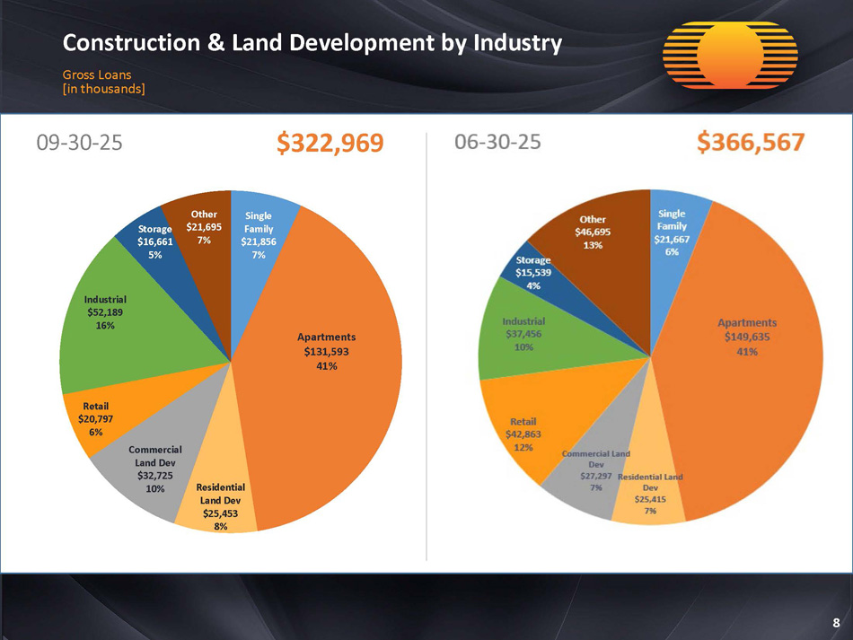 Commercial Real Estate Office and Retail All Data as of 09/30/25 7 Gross Loans [in thousands] Office - $177,692 Retail + Restaurant - $395,640 100% of Office Portfolio – Pass Rated Restaurants Neighborhood & Shopping Center Mixed - Use Single Tenant Strip Center $101,825 $67,746 $22,196 $58,567 $145,306 Outstanding Balance 83 14 15 72 62 # of Loans $1,198 $4,839 $1,480 $813 $2,306 Avg. Loan Size 57% 51% 61% 50% 58% Weighted Avg. LTV 100% of Retail Portfolio – Pass Rated Traditional Medical $155,663 $22,029 Outstanding Balance 105 18 # of Loans $1,483 $1,159 Avg. Loan Size Owner Occupied 69% Weighted Avg. LTV $18,123 49 # of Loans $370 Avg. Loan Size 45% Weighted Avg. LTV Other Office Sq. Ft. $88,441 >100,000 $21,883 20,000 - 100,000 $27,217 <20,000 56 # of Loans $2,456 Avg. Loan Size 43% Weighted Avg. LTV