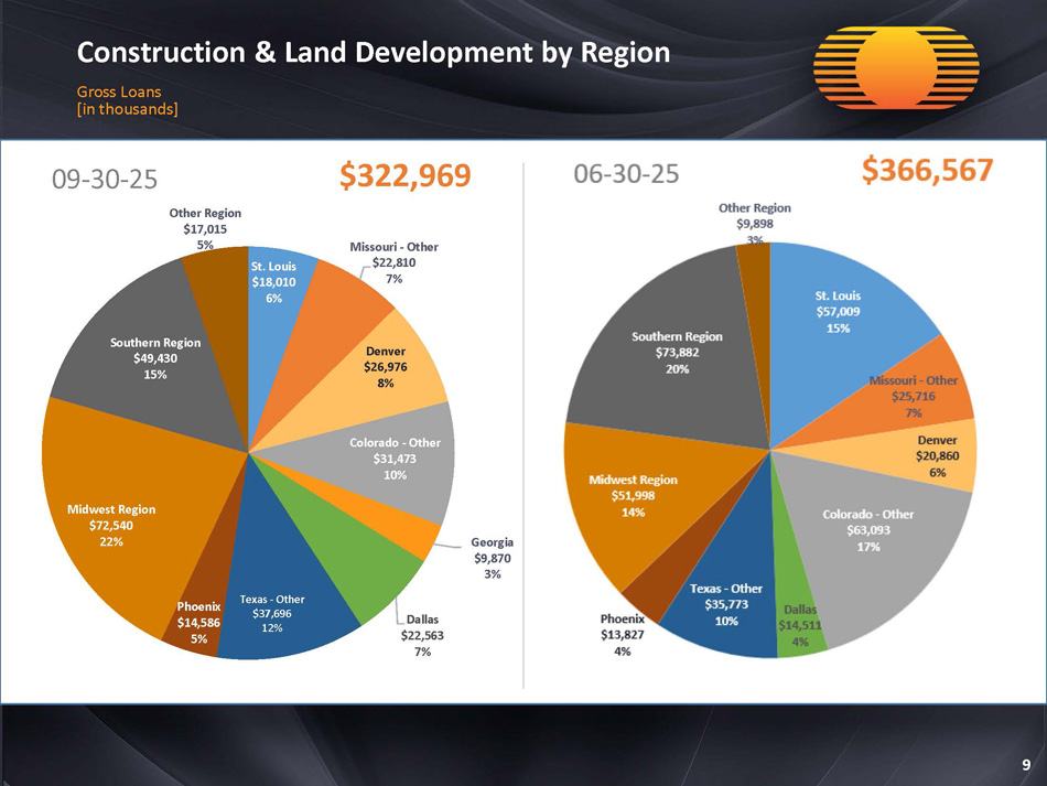 Construction & Land Development by Region Gross Loans [in thousands] St. Louis $18,010 6% Missouri - Other $22,810 7% Denver $26,976 8% Colorado - Other $31,473 10% Georgia $9,870 3% Dallas $22,563 7% Texas - Other $37,696 12% Phoenix $14,586 5% Midwest Region $72,540 22% Southern Region $49,430 15% Other Region $17,015 5% 09 - 30 - 25 $322,969 9