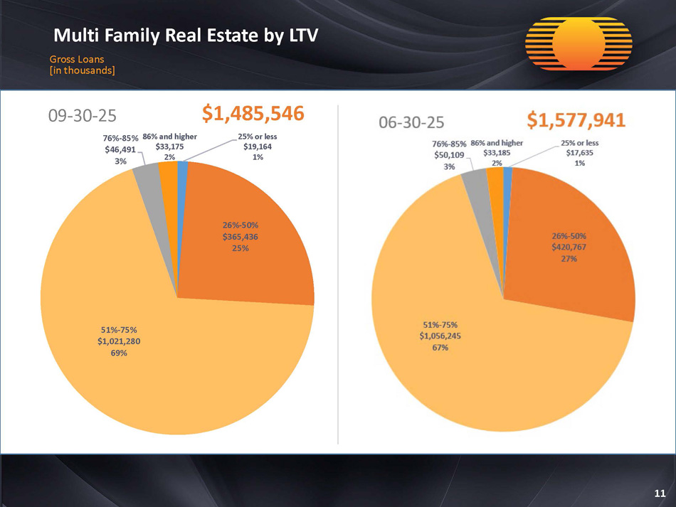 Loan Portfolio Gross Loans [in thousands] *Includes Home Equity Loans of $123,359 *Includes Home Equity Loans of $117,650 09 - 30 - 25 $4,543,707 Consumer* $171,519 4% Single Family Real Estate $802,384 17% Multi - family Real Estate $1,485,546 33% Commercial Real Estate $1,530,990 34% Land Dev $322,969 7% Commercial Business Const & $230,299 5% 2