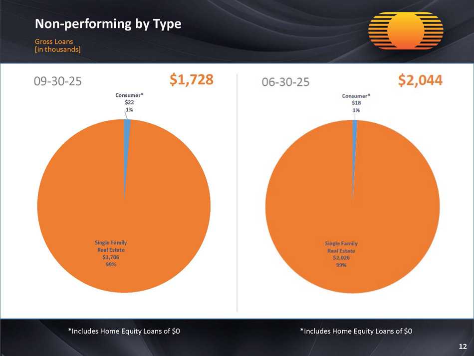 Non - performing by Type Gross Loans [in thousands] 09 - 30 - 25 $1,728 *Includes Home Equity Loans of $0 *Includes Home Equity Loans of $0 Consumer* $22 1% Single Family Real Estate $1,706 99% 12