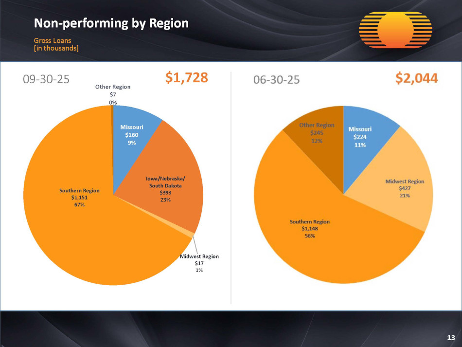 Non - performing by Region Gross Loans [in thousands] Missouri $160 9% Iowa/Nebraska/ South $393 23% Southern Region $1,151 67% Other Region $7 0% Midwest $17 1% 09 - 30 - 25 $1,728 13