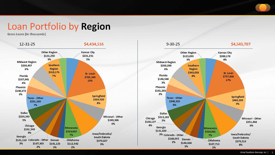 Consumer* $174,448 4% Single Family Real Estate $788,835 18% Multi - family Real Estate $1,387,410 31% Commercial Real Estate $1,556,148 35% Const & Land Dev $349,161 8% Commercial Business $178,514 4% 2 Great Southern Bancorp. Inc | Loan Portfolio by Category Gross Loans [in thousands] *Includes Home Equity Loans of $128,030 12 - 31 - 25 $4,434,516 *Includes Home Equity Loans of $123,359 9 - 30 - 25 $4,543,707 Consumer* $171,519 4% Single Family Real Estate $802,384 17% Multi - family Real Estate $1,485,546 33% Commercial Real Estate $1,530,990 34% Const & Land Dev $322,969 7% Commercial Business $230,299 5%