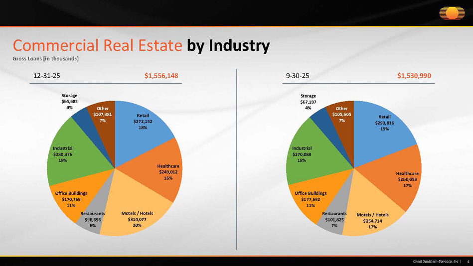Kansas City $231,251 5% St. Louis $709,349 16% Springfield $369,920 8% Missouri - Other $249,306 6% Iowa/Nebraska/ South Dakota $379,027 9% Minnesota $324,063 7% Oklahoma $112,942 2% Denver $141,126 3% Colorado - Other $107,303 2% Georgia $121,118 3% Chicago $161,543 4% Dallas $209,343 5% Texas - Other $291,389 7% Phoenix $140,272 3% Florida $167,641 4% Midwest Region $269,497 6% Southern Region $318,176 7% Other Region $131,250 3% 3 Great Southern Bancorp. Inc | Loan Portfolio by Region Gross Loans [in thousands] 12 - 31 - 25 $4,434,516 9 - 30 - 25 $4,543,707 Kansas City $200,178 4% St. Louis $757,898 17% Springfield $402,209 9% Missouri - Other $251,468 6% Iowa/Nebraska/ South Dakota $379,519 8% Minnesota $324,601 7% Oklahoma $107,713 2% Denver $146,660 3% Colorado - Other $108,695 2% Georgia $131,020 3% Chicago $160,137 4% Dallas $213,183 5% Texas - Other $346,326 8% Phoenix $141,203 3% Florida $146,540 3% Midwest Region $260,200 6% Southern Region $343,058 8% Other Region $123,099 3%
