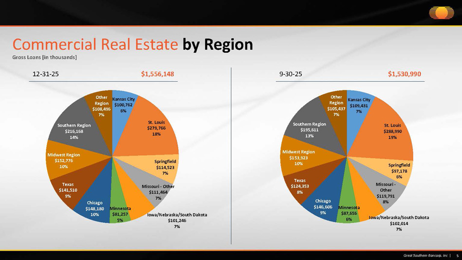 Retail $272,152 18% Healthcare $249,012 16% Motels / Hotels $314,077 20% Restaurants $96,696 6% Office Buildings $170,769 11% Industrial $280,376 18% Storage $65,685 4% Other $107,381 7% Commercial Real Estate by Industry Gross Loans [in thousands] 4 Great Southern Bancorp. Inc | 12 - 31 - 25 $1,556,148 9 - 30 - 25 $1,530,990 Retail $293,816 19% Healthcare $260,053 17% Motels / Hotels $254,714 17% Restaurants $101,825 7% Office Buildings $177,692 11% Industrial $270,088 18% Storage $67,197 4% Other $105,605 7%