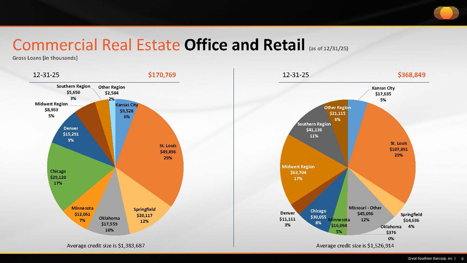 Kansas City $100,762 6% St. Louis $279,766 18% Springfield $114,523 7% Missouri - Other $111,464 7% Iowa/Nebraska/South Dakota $101,246 7% Minnesota $81,257 5% Chicago $148,180 10% Texas $141,510 9% Midwest Region $152,776 10% Southern Region $216,168 14% Other Region $108,496 7% 5 Great Southern Bancorp. Inc | Commercial Real Estate by Region Gross Loans [in thousands] 12 - 31 - 25 9 - 30 - 25 $1,556,148 $1,530,990 Kansas City $109,431 7% St. Louis $288,990 19% Springfield $97,178 6% Missouri - Other $119,791 8% Iowa/Nebraska/South Dakota $102,014 7% Minnesota $87,656 6% Chicago $146,606 9% Texas $124,353 8% Midwest Region $153,923 10% Southern Region $195,611 13% Other Region $105,437 7%