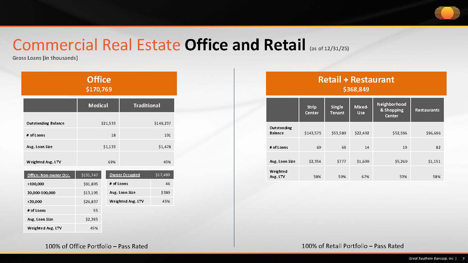Kansas City $17,635 5% St. Louis $107,891 29% Springfield $14,636 4% Missouri - Other $45,096 12% Oklahoma $376 0% Minnesota $16,094 5% Chicago $30,055 8% Denver $11,111 3% Midwest Region $63,704 17% Southern Region $41,136 11% Other Region $21,115 6% Kansas City $9,528 6% St. Louis $49,896 29% Springfield $20,117 12% Oklahoma $17,559 10% Minnesota $12,061 7% Chicago $29,120 17% Denver $15,291 9% Midwest Region $8,963 5% Southern Region $5,650 3% Other Region $2,584 2% 6 Great Southern Bancorp. Inc | Commercial Real Estate Office and Retail (as of 12/31/25) Gross Loans [in thousands] Average credit size is $1,383,687 12 - 31 - 25 $170,769 Average credit size is $1,526,914 12 - 31 - 25 $368,849
