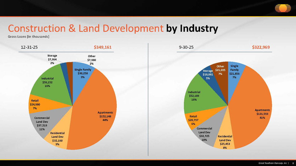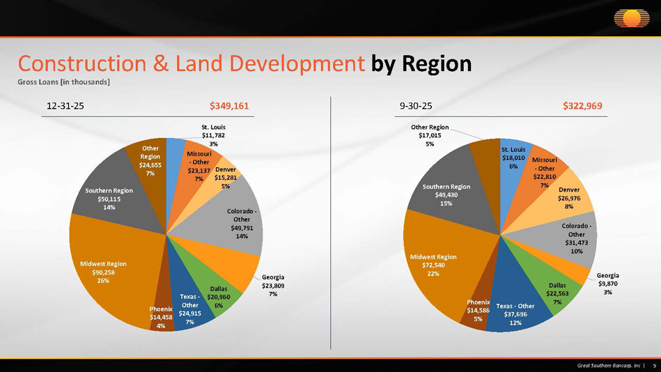 Single Family $30,258 9% Apartments $152,148 44% Residential Land Dev $32,160 9% Commercial Land Dev $37,519 11% Retail $24,980 7% Industrial $56,152 16% Storage $7,964 2% Other $7,980 2% 8 Great Southern Bancorp. Inc | Construction & Land Development by Industry Gross Loans [in thousands] 12 - 31 - 25 9 - 30 - 25 $349,161 $322,969 Single Family $21,856 7% Apartments $131,593 41% Residential Land Dev $25,453 8% Commercial Land Dev $32,725 10% Retail $20,797 6% Industrial $52,189 16% Storage $16,661 5% Other $21,695 7%