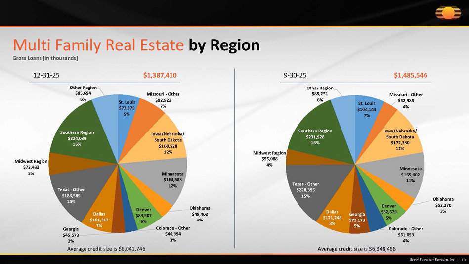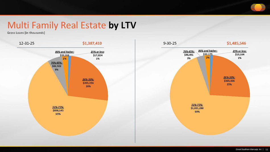 St. Louis $73,379 5% Missouri - Other $92,823 7% Iowa/Nebraska/ South Dakota $160,528 12% Minnesota $164,683 12% Oklahoma $48,402 4% Denver $89,507 6% Colorado - Other $40,394 3% Georgia $45,573 3% Dallas $101,317 7% Texas - Other $188,589 14% Midwest Region $72,482 5% Southern Region $224,039 16% Other Region $85,694 6% 10 Great Southern Bancorp. Inc | Multi Family Real Estate by Region Gross Loans [in thousands] 12 - 31 - 25 $1,387,410 9 - 30 - 25 $1,485,546 Average credit size is $6, 041,746 Average credit size is $6,348,488 St. Louis $104,144 7% Missouri - Other $52,985 4% Iowa/Nebraska/ South Dakota $172,330 12% Minnesota $165,002 11% Oklahoma $52,270 3% Denver $82,679 5% Colorado - Other $61,053 4% Georgia $73,173 5% Dallas $121,248 8% Texas - Other $228,395 15% Midwest Region $55,088 4% Southern Region $231,928 16% Other Region $85,251 6%