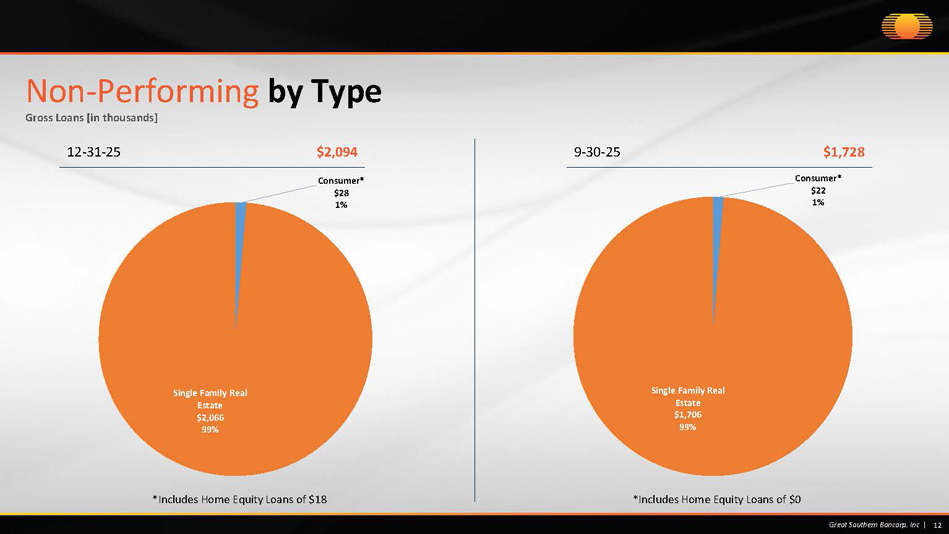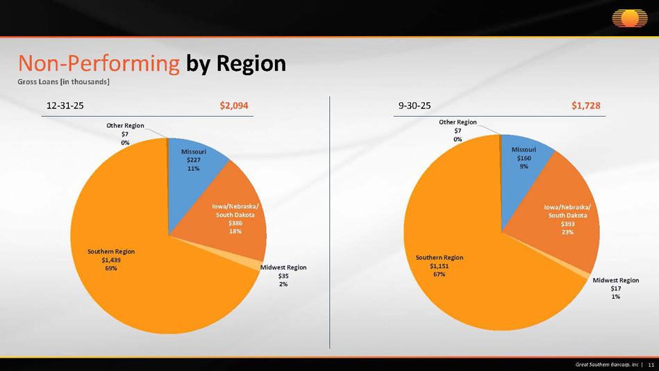 Consumer* $28 1% Single Family Real Estate $2,066 99% 12 Great Southern Bancorp. Inc | Non - Performing by Type Gross Loans [in thousands] 12 - 31 - 25 $ 2,094 9 - 30 - 25 $1,728 *Includes Home Equity Loans of $18 *Includes Home Equity Loans of $0 Consumer* $22 1% Single Family Real Estate $1,706 99%