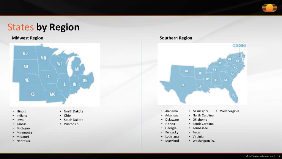 Midwest Region Southern Region 14 Great Southern Bancorp. Inc | • Illinois • Indiana • Iowa • Kansas • Michigan • Minnesota • Missouri • Nebraska • North Dakota • Ohio • South Dakota • Wisconsin • Alabama • Arkansas • Delaware • Florida • Georgia • Kentucky • Louisiana • Maryland • Mississippi • North Carolina • Oklahoma • South Carolina • Tennessee • Texas • Virginia • Washington DC • West Virginia States by Region