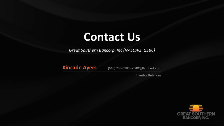 Contact Us (616) 233 - 0500 - GSBC@lambert.com Kincade Ayers Investor Relations Great Southern Bancorp. Inc (NASDAQ: GSBC)