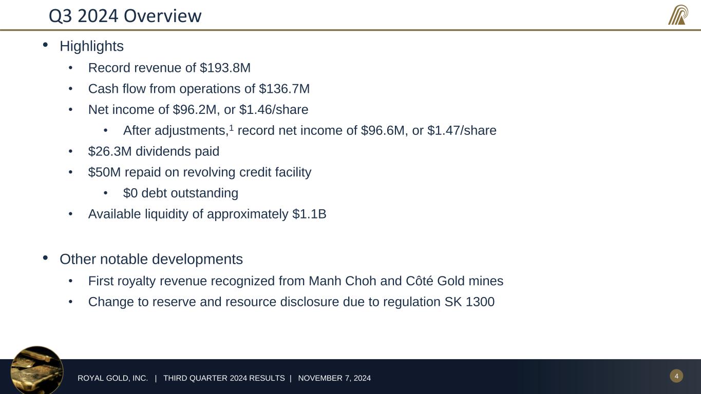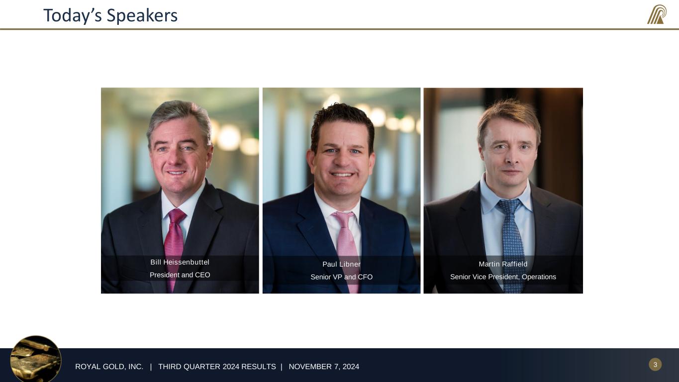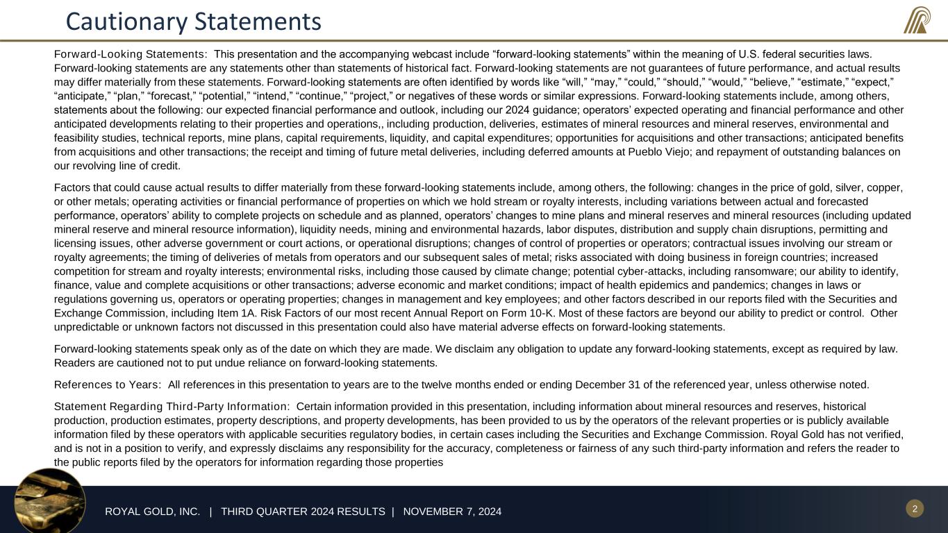 2ROYAL GOLD, INC. | THIRD QUARTER 2024 RESULTS | NOVEMBER 7, 2024 Cautionary Statements Forward-Looking Statements: This presentation and the accompanying webcast include “forward-looking statements” within the meaning of U.S. federal securities laws. Forward-looking statements are any statements other than statements of historical fact. Forward-looking statements are not guarantees of future performance, and actual results may differ materially from these statements. Forward-looking statements are often identified by words like “will,” “may,” “could,” “should,” “would,” “believe,” “estimate,” “expect,” “anticipate,” “plan,” “forecast,” “potential,” “intend,” “continue,” “project,” or negatives of these words or similar expressions. Forward-looking statements include, among others, statements about the following: our expected financial performance and outlook, including our 2024 guidance; operators’ expected operating and financial performance and other anticipated developments relating to their properties and operations,, including production, deliveries, estimates of mineral resources and mineral reserves, environmental and feasibility studies, technical reports, mine plans, capital requirements, liquidity, and capital expenditures; opportunities for acquisitions and other transactions; anticipated benefits from acquisitions and other transactions; the receipt and timing of future metal deliveries, including deferred amounts at Pueblo Viejo; and repayment of outstanding balances on our revolving line of credit. Factors that could cause actual results to differ materially from these forward-looking statements include, among others, the following: changes in the price of gold, silver, copper, or other metals; operating activities or financial performance of properties on which we hold stream or royalty interests, including variations between actual and forecasted performance, operators’ ability to complete projects on schedule and as planned, operators’ changes to mine plans and mineral reserves and mineral resources (including updated mineral reserve and mineral resource information), liquidity needs, mining and environmental hazards, labor disputes, distribution and supply chain disruptions, permitting and licensing issues, other adverse government or court actions, or operational disruptions; changes of control of properties or operators; contractual issues involving our stream or royalty agreements; the timing of deliveries of metals from operators and our subsequent sales of metal; risks associated with doing business in foreign countries; increased competition for stream and royalty interests; environmental risks, including those caused by climate change; potential cyber-attacks, including ransomware; our ability to identify, finance, value and complete acquisitions or other transactions; adverse economic and market conditions; impact of health epidemics and pandemics; changes in laws or regulations governing us, operators or operating properties; changes in management and key employees; and other factors described in our reports filed with the Securities and Exchange Commission, including Item 1A. Risk Factors of our most recent Annual Report on Form 10-K. Most of these factors are beyond our ability to predict or control. Other unpredictable or unknown factors not discussed in this presentation could also have material adverse effects on forward-looking statements. Forward-looking statements speak only as of the date on which they are made. We disclaim any obligation to update any forward-looking statements, except as required by law. Readers are cautioned not to put undue reliance on forward-looking statements. References to Years: All references in this presentation to years are to the twelve months ended or ending December 31 of the referenced year, unless otherwise noted. Statement Regarding Third-Party Information: Certain information provided in this presentation, including information about mineral resources and reserves, historical production, production estimates, property descriptions, and property developments, has been provided to us by the operators of the relevant properties or is publicly available information filed by these operators with applicable securities regulatory bodies, in certain cases including the Securities and Exchange Commission. Royal Gold has not verified, and is not in a position to verify, and expressly disclaims any responsibility for the accuracy, completeness or fairness of any such third-party information and refers the reader to the public reports filed by the operators for information regarding those properties .