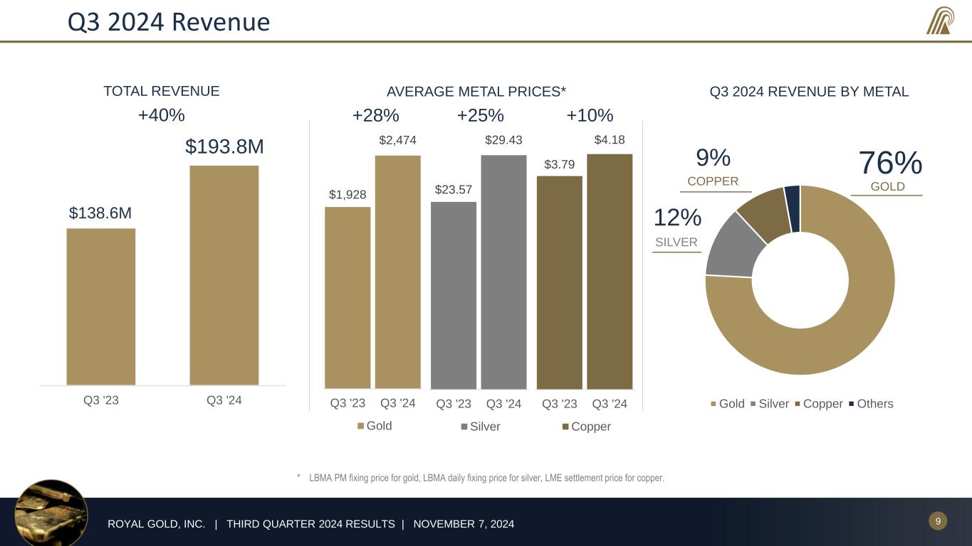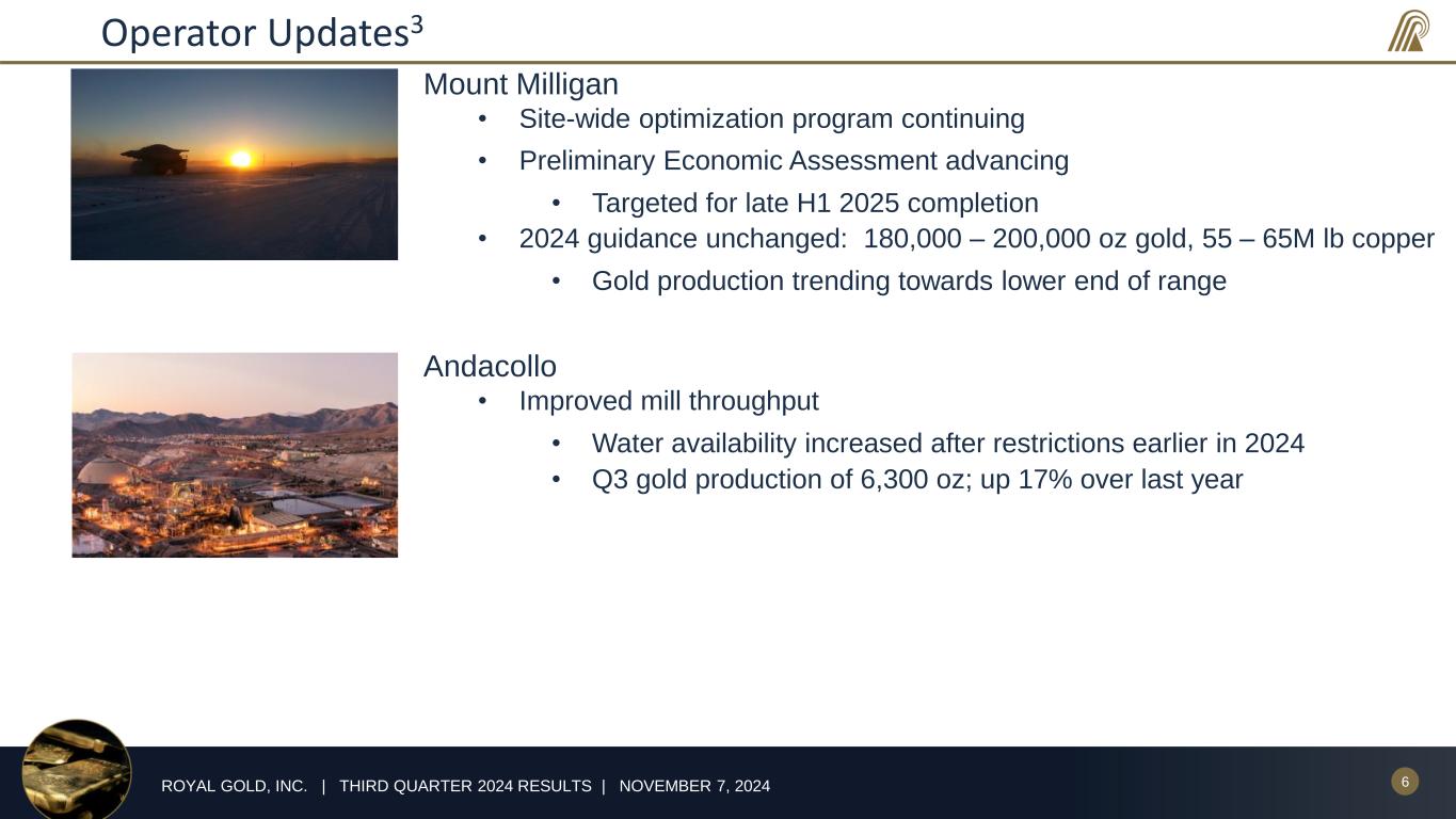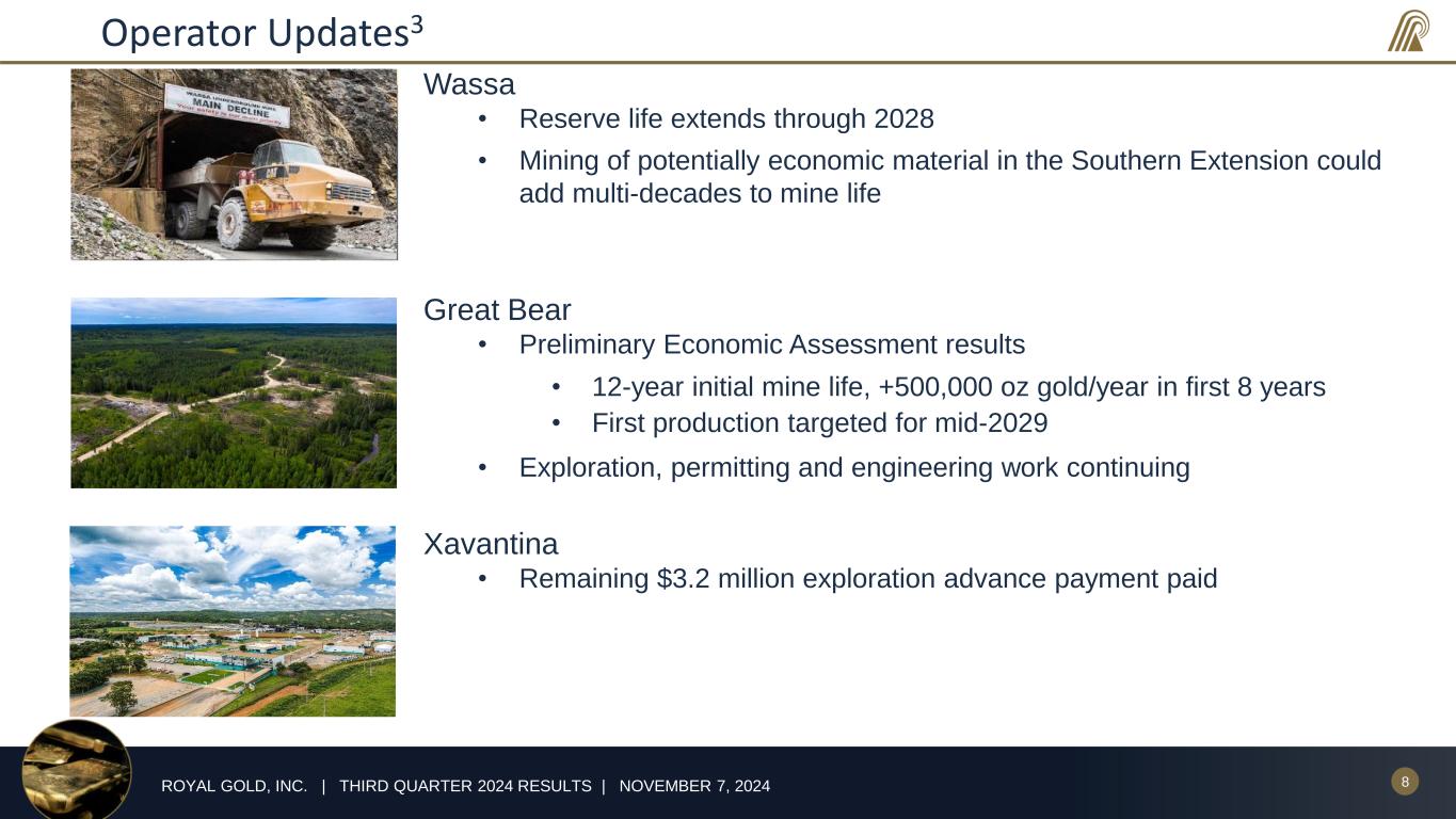 2ROYAL GOLD, INC. | THIRD QUARTER 2024 RESULTS | NOVEMBER 7, 2024 Cautionary Statements Forward-Looking Statements: This presentation and the accompanying webcast include “forward-looking statements” within the meaning of U.S. federal securities laws. Forward-looking statements are any statements other than statements of historical fact. Forward-looking statements are not guarantees of future performance, and actual results may differ materially from these statements. Forward-looking statements are often identified by words like “will,” “may,” “could,” “should,” “would,” “believe,” “estimate,” “expect,” “anticipate,” “plan,” “forecast,” “potential,” “intend,” “continue,” “project,” or negatives of these words or similar expressions. Forward-looking statements include, among others, statements about the following: our expected financial performance and outlook, including our 2024 guidance; operators’ expected operating and financial performance and other anticipated developments relating to their properties and operations,, including production, deliveries, estimates of mineral resources and mineral reserves, environmental and feasibility studies, technical reports, mine plans, capital requirements, liquidity, and capital expenditures; opportunities for acquisitions and other transactions; anticipated benefits from acquisitions and other transactions; the receipt and timing of future metal deliveries, including deferred amounts at Pueblo Viejo; and repayment of outstanding balances on our revolving line of credit. Factors that could cause actual results to differ materially from these forward-looking statements include, among others, the following: changes in the price of gold, silver, copper, or other metals; operating activities or financial performance of properties on which we hold stream or royalty interests, including variations between actual and forecasted performance, operators’ ability to complete projects on schedule and as planned, operators’ changes to mine plans and mineral reserves and mineral resources (including updated mineral reserve and mineral resource information), liquidity needs, mining and environmental hazards, labor disputes, distribution and supply chain disruptions, permitting and licensing issues, other adverse government or court actions, or operational disruptions; changes of control of properties or operators; contractual issues involving our stream or royalty agreements; the timing of deliveries of metals from operators and our subsequent sales of metal; risks associated with doing business in foreign countries; increased competition for stream and royalty interests; environmental risks, including those caused by climate change; potential cyber-attacks, including ransomware; our ability to identify, finance, value and complete acquisitions or other transactions; adverse economic and market conditions; impact of health epidemics and pandemics; changes in laws or regulations governing us, operators or operating properties; changes in management and key employees; and other factors described in our reports filed with the Securities and Exchange Commission, including Item 1A. Risk Factors of our most recent Annual Report on Form 10-K. Most of these factors are beyond our ability to predict or control. Other unpredictable or unknown factors not discussed in this presentation could also have material adverse effects on forward-looking statements. Forward-looking statements speak only as of the date on which they are made. We disclaim any obligation to update any forward-looking statements, except as required by law. Readers are cautioned not to put undue reliance on forward-looking statements. References to Years: All references in this presentation to years are to the twelve months ended or ending December 31 of the referenced year, unless otherwise noted. Statement Regarding Third-Party Information: Certain information provided in this presentation, including information about mineral resources and reserves, historical production, production estimates, property descriptions, and property developments, has been provided to us by the operators of the relevant properties or is publicly available information filed by these operators with applicable securities regulatory bodies, in certain cases including the Securities and Exchange Commission. Royal Gold has not verified, and is not in a position to verify, and expressly disclaims any responsibility for the accuracy, completeness or fairness of any such third-party information and refers the reader to the public reports filed by the operators for information regarding those properties .
