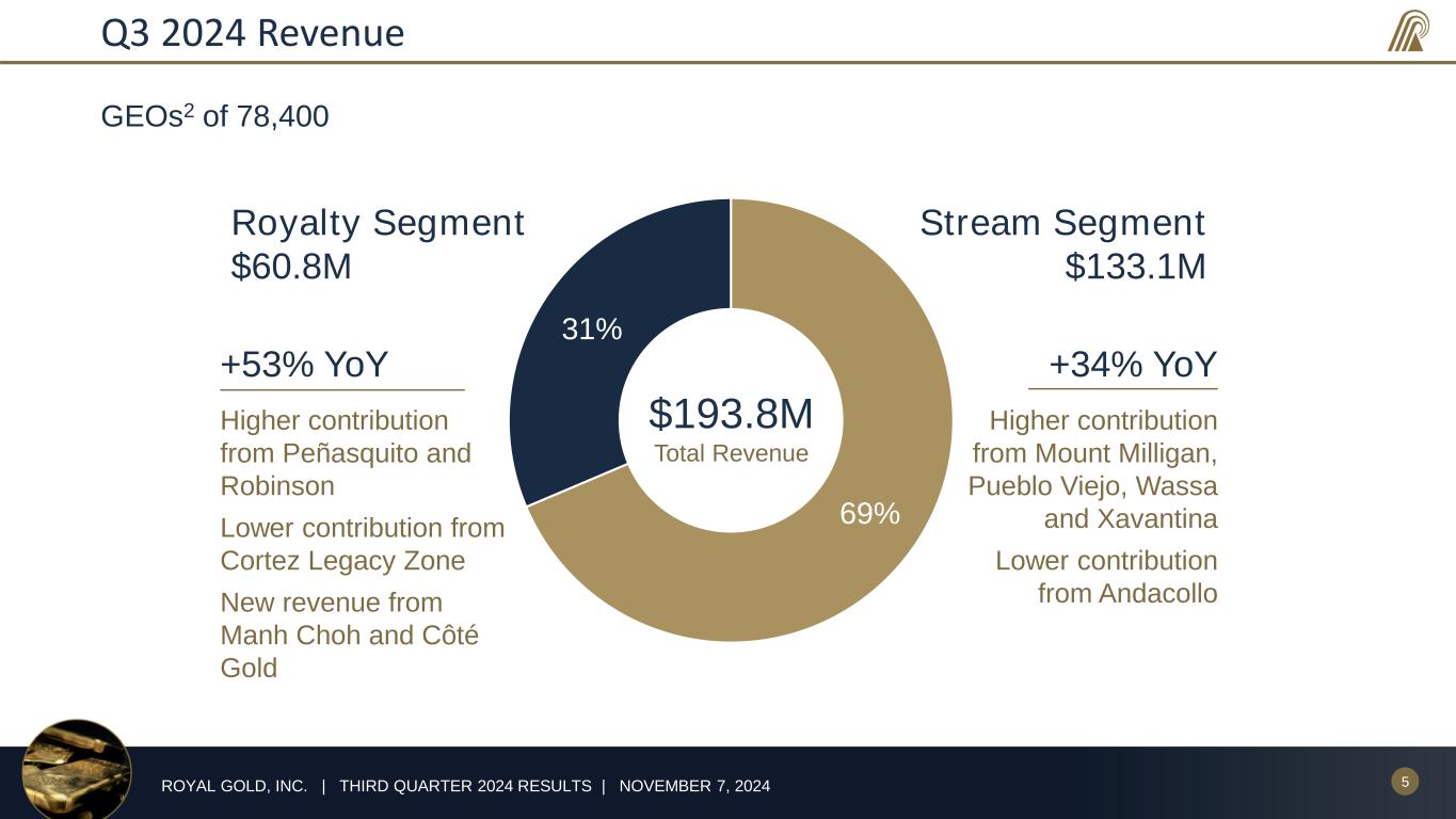 4ROYAL GOLD, INC. | THIRD QUARTER 2024 RESULTS | NOVEMBER 7, 2024 Q3 2024 Overview • Highlights • Record revenue of $193.8M • Cash flow from operations of $136.7M • Net income of $96.2M, or $1.46/share • After adjustments,1 record net income of $96.6M, or $1.47/share • $26.3M dividends paid • $50M repaid on revolving credit facility • $0 debt outstanding • Available liquidity of approximately $1.1B • Other notable developments • First royalty revenue recognized from Manh Choh and Côté Gold mines • Change to reserve and resource disclosure due to regulation SK 1300