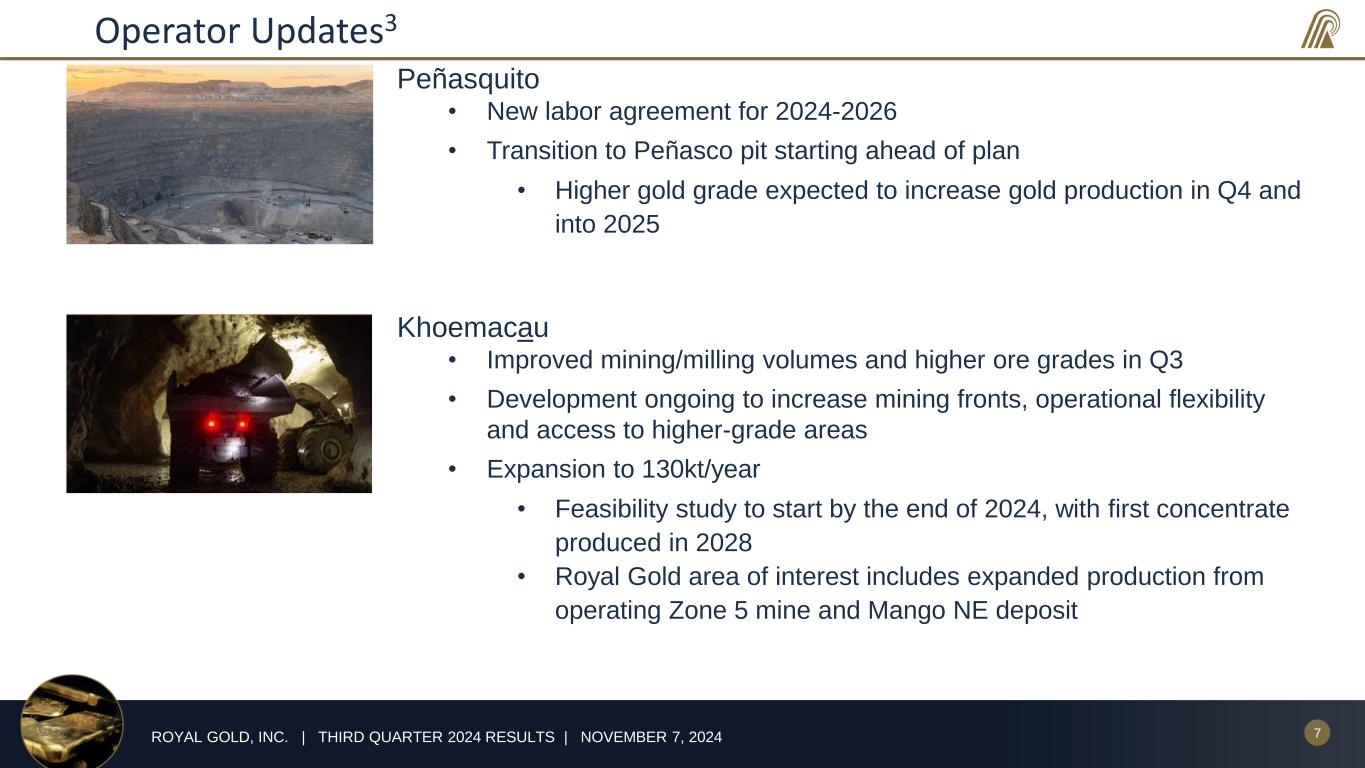 6ROYAL GOLD, INC. | THIRD QUARTER 2024 RESULTS | NOVEMBER 7, 2024 Operator Updates3 Mount Milligan • Site-wide optimization program continuing • Preliminary Economic Assessment advancing • Targeted for late H1 2025 completion • 2024 guidance unchanged: 180,000 – 200,000 oz gold, 55 – 65M lb copper • Gold production trending towards lower end of range Andacollo • Improved mill throughput • Water availability increased after restrictions earlier in 2024 • Q3 gold production of 6,300 oz; up 17% over last year