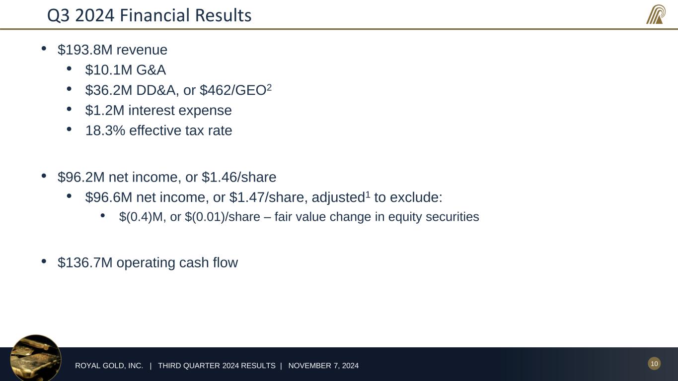 9ROYAL GOLD, INC. | THIRD QUARTER 2024 RESULTS | NOVEMBER 7, 2024 Q3 2024 Revenue * LBMA PM fixing price for gold, LBMA daily fixing price for silver, LME settlement price for copper. Gold Silver Copper Others AVERAGE METAL PRICES* $1,928 $2,474 Q3 '23 Q3 '24 Gold $23.57 $29.43 Q3 '23 Q3 '24 Silver $3.79 $4.18 Q3 '23 Q3 '24 Copper +28% +10%+25% TOTAL REVENUE Q3 '23 Q3 '24 GOLD 76% Q3 2024 REVENUE BY METAL $193.8M $138.6M 9% 12% SILVER COPPER +40%