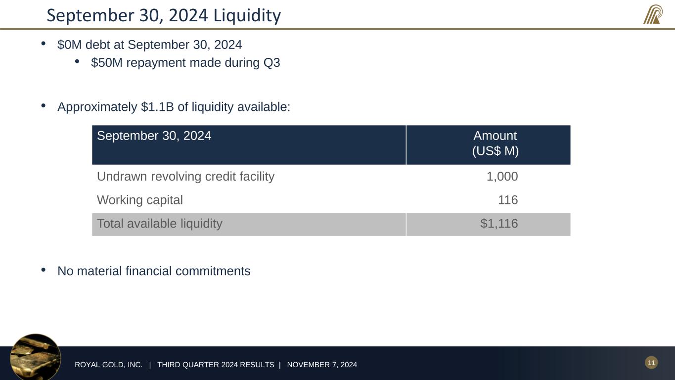 11ROYAL GOLD, INC. | THIRD QUARTER 2024 RESULTS | NOVEMBER 7, 2024 September 30, 2024 Liquidity • $0M debt at September 30, 2024 • $50M repayment made during Q3 • Approximately $1.1B of liquidity available: • No material financial commitments September 30, 2024 Amount (US$ M) Undrawn revolving credit facility 1,000 Working capital 116 Total available liquidity $1,116