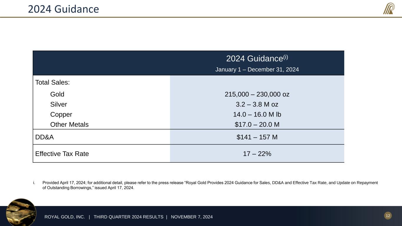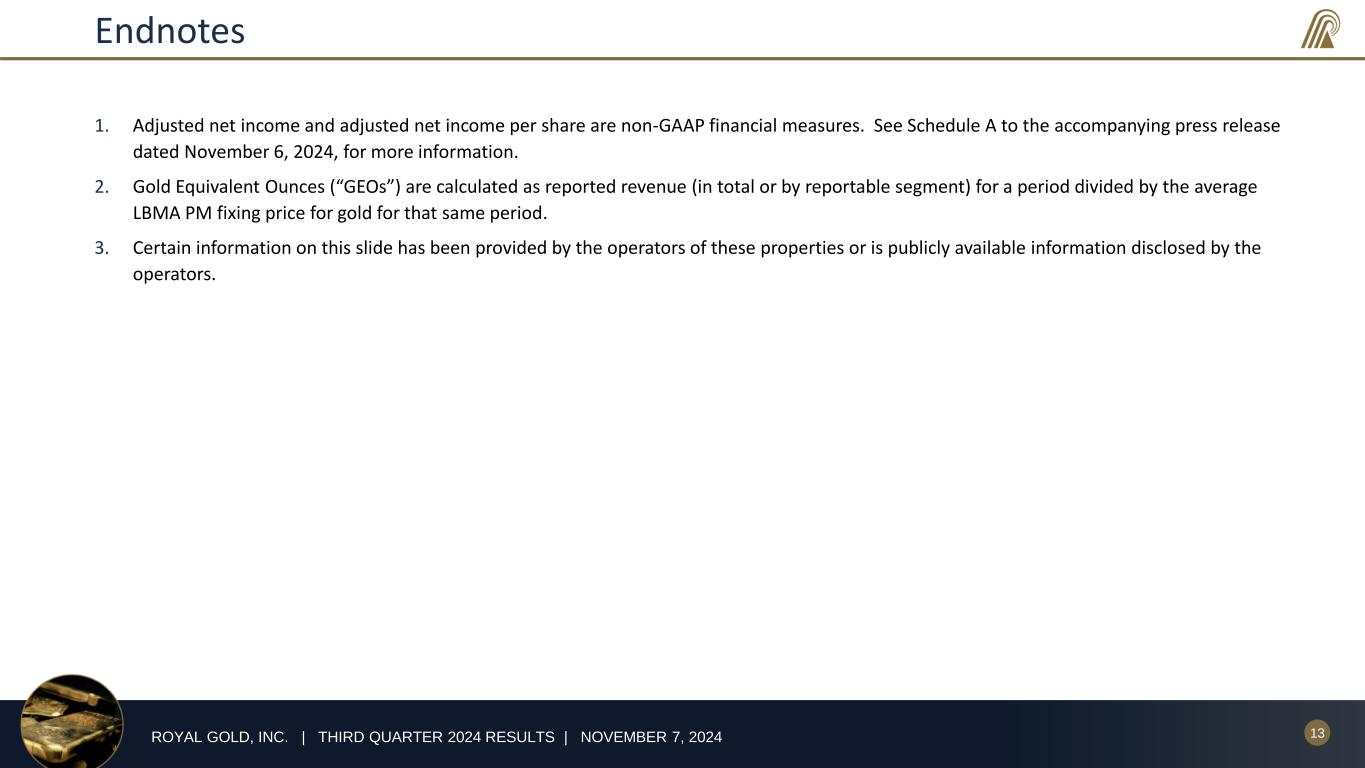12ROYAL GOLD, INC. | THIRD QUARTER 2024 RESULTS | NOVEMBER 7, 2024 2024 Guidance 2024 Guidance(i) January 1 – December 31, 2024 Total Sales: Gold 215,000 – 230,000 oz Silver 3.2 – 3.8 M oz Copper 14.0 – 16.0 M lb Other Metals $17.0 – 20.0 M DD&A $141 – 157 M Effective Tax Rate 17 – 22% i. Provided April 17, 2024; for additional detail, please refer to the press release “Royal Gold Provides 2024 Guidance for Sales, DD&A and Effective Tax Rate, and Update on Repayment of Outstanding Borrowings,” issued April 17, 2024.