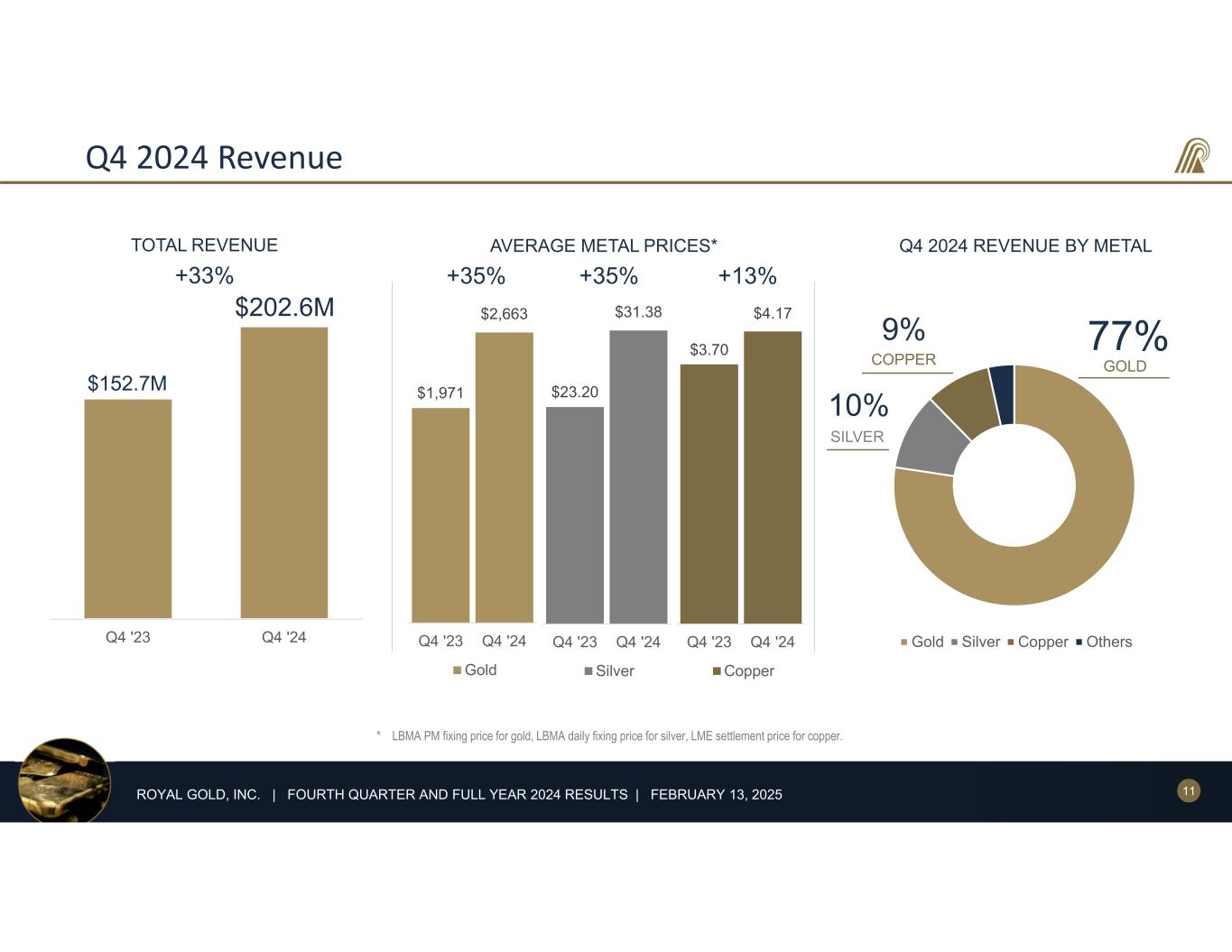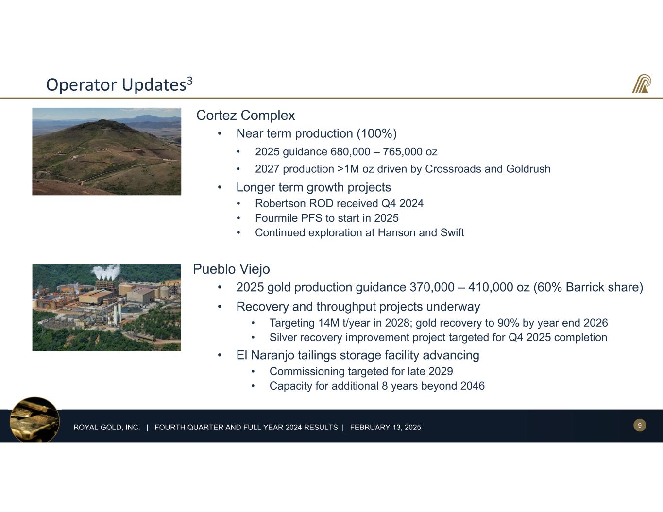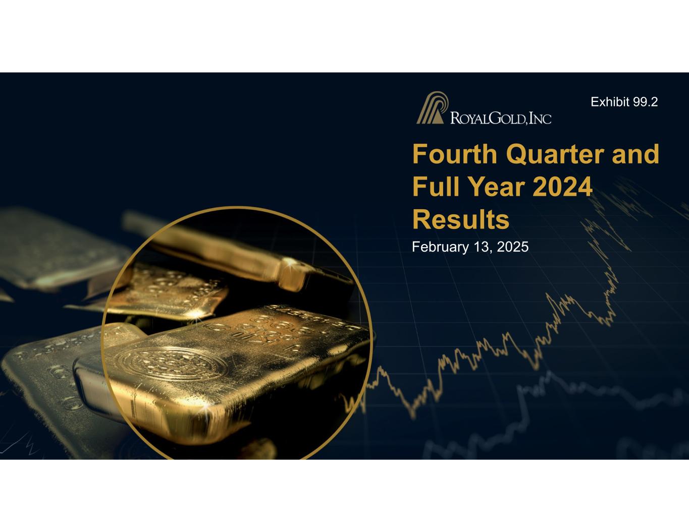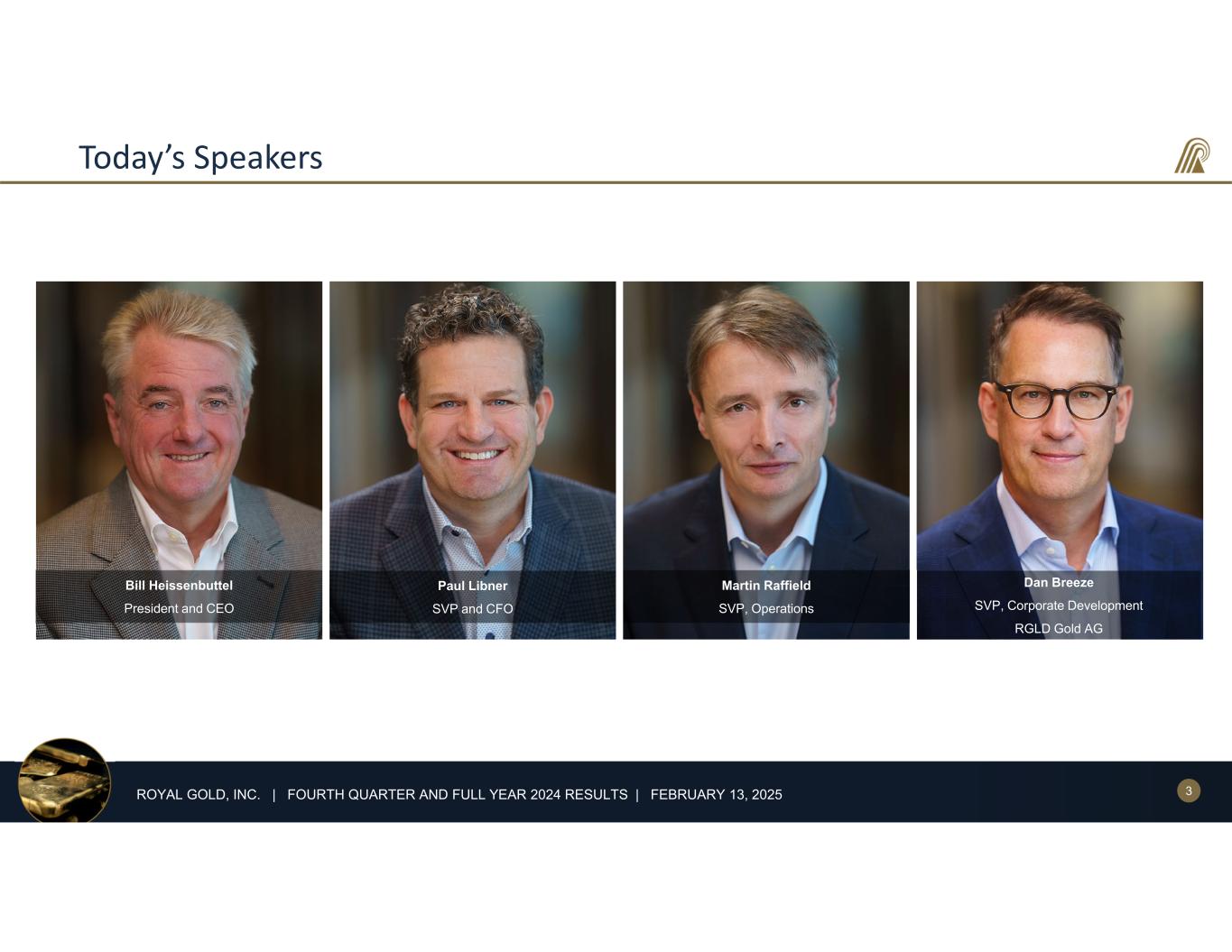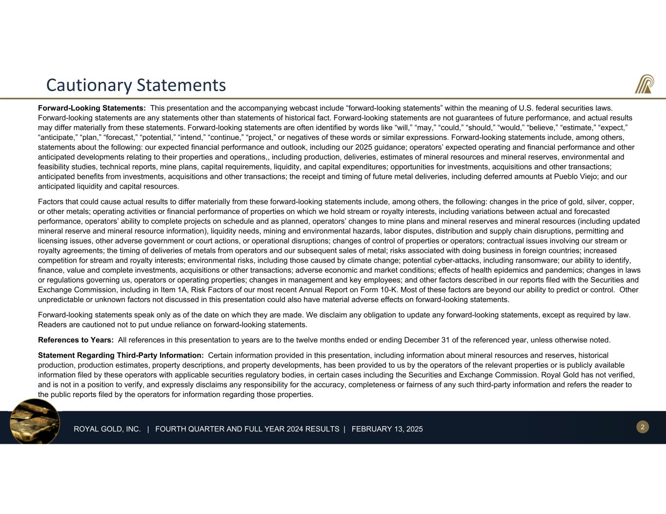 2ROYAL GOLD, INC. | FOURTH QUARTER AND FULL YEAR 2024 RESULTS | FEBRUARY 13, 2025 Cautionary Statements Forward-Looking Statements: This presentation and the accompanying webcast include “forward-looking statements” within the meaning of U.S. federal securities laws. Forward-looking statements are any statements other than statements of historical fact. Forward-looking statements are not guarantees of future performance, and actual results may differ materially from these statements. Forward-looking statements are often identified by words like “will,” “may,” “could,” “should,” “would,” “believe,” “estimate,” “expect,” “anticipate,” “plan,” “forecast,” “potential,” “intend,” “continue,” “project,” or negatives of these words or similar expressions. Forward-looking statements include, among others, statements about the following: our expected financial performance and outlook, including our 2025 guidance; operators’ expected operating and financial performance and other anticipated developments relating to their properties and operations,, including production, deliveries, estimates of mineral resources and mineral reserves, environmental and feasibility studies, technical reports, mine plans, capital requirements, liquidity, and capital expenditures; opportunities for investments, acquisitions and other transactions; anticipated benefits from investments, acquisitions and other transactions; the receipt and timing of future metal deliveries, including deferred amounts at Pueblo Viejo; and our anticipated liquidity and capital resources. Factors that could cause actual results to differ materially from these forward-looking statements include, among others, the following: changes in the price of gold, silver, copper, or other metals; operating activities or financial performance of properties on which we hold stream or royalty interests, including variations between actual and forecasted performance, operators’ ability to complete projects on schedule and as planned, operators’ changes to mine plans and mineral reserves and mineral resources (including updated mineral reserve and mineral resource information), liquidity needs, mining and environmental hazards, labor disputes, distribution and supply chain disruptions, permitting and licensing issues, other adverse government or court actions, or operational disruptions; changes of control of properties or operators; contractual issues involving our stream or royalty agreements; the timing of deliveries of metals from operators and our subsequent sales of metal; risks associated with doing business in foreign countries; increased competition for stream and royalty interests; environmental risks, including those caused by climate change; potential cyber-attacks, including ransomware; our ability to identify, finance, value and complete investments, acquisitions or other transactions; adverse economic and market conditions; effects of health epidemics and pandemics; changes in laws or regulations governing us, operators or operating properties; changes in management and key employees; and other factors described in our reports filed with the Securities and Exchange Commission, including in Item 1A, Risk Factors of our most recent Annual Report on Form 10-K. Most of these factors are beyond our ability to predict or control. Other unpredictable or unknown factors not discussed in this presentation could also have material adverse effects on forward-looking statements. Forward-looking statements speak only as of the date on which they are made. We disclaim any obligation to update any forward-looking statements, except as required by law. Readers are cautioned not to put undue reliance on forward-looking statements. References to Years: All references in this presentation to years are to the twelve months ended or ending December 31 of the referenced year, unless otherwise noted. Statement Regarding Third-Party Information: Certain information provided in this presentation, including information about mineral resources and reserves, historical production, production estimates, property descriptions, and property developments, has been provided to us by the operators of the relevant properties or is publicly available information filed by these operators with applicable securities regulatory bodies, in certain cases including the Securities and Exchange Commission. Royal Gold has not verified, and is not in a position to verify, and expressly disclaims any responsibility for the accuracy, completeness or fairness of any such third-party information and refers the reader to the public reports filed by the operators for information regarding those properties. .
