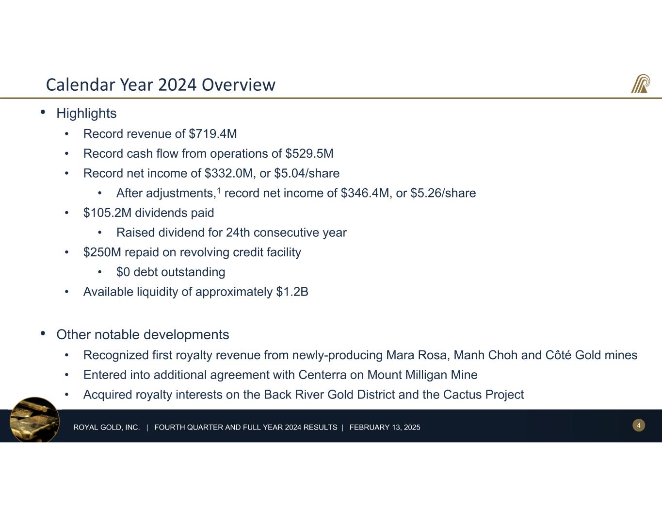 3ROYAL GOLD, INC. | FOURTH QUARTER AND FULL YEAR 2024 RESULTS | FEBRUARY 13, 2025 Today’s Speakers Dan Breeze SVP, Corporate Development RGLD Gold AG Bill Heissenbuttel President and CEO Paul Libner SVP and CFO Martin Raffield SVP, Operations