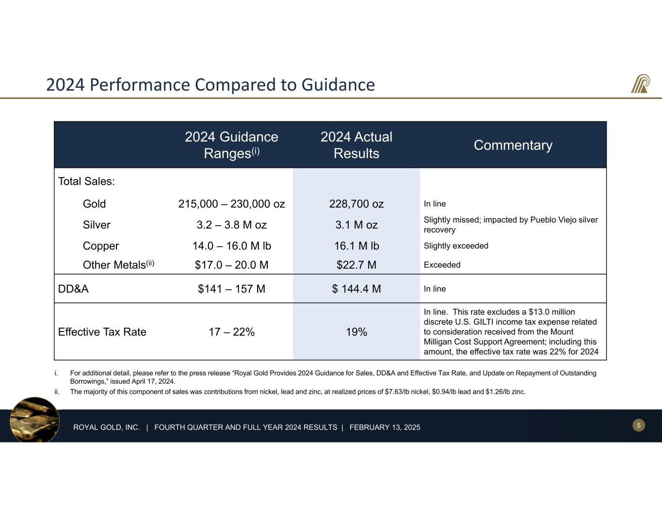 4ROYAL GOLD, INC. | FOURTH QUARTER AND FULL YEAR 2024 RESULTS | FEBRUARY 13, 2025 Calendar Year 2024 Overview • Highlights • Record revenue of $719.4M • Record cash flow from operations of $529.5M • Record net income of $332.0M, or $5.04/share • After adjustments,1 record net income of $346.4M, or $5.26/share • $105.2M dividends paid • Raised dividend for 24th consecutive year • $250M repaid on revolving credit facility • $0 debt outstanding • Available liquidity of approximately $1.2B • Other notable developments • Recognized first royalty revenue from newly-producing Mara Rosa, Manh Choh and Côté Gold mines • Entered into additional agreement with Centerra on Mount Milligan Mine • Acquired royalty interests on the Back River Gold District and the Cactus Project