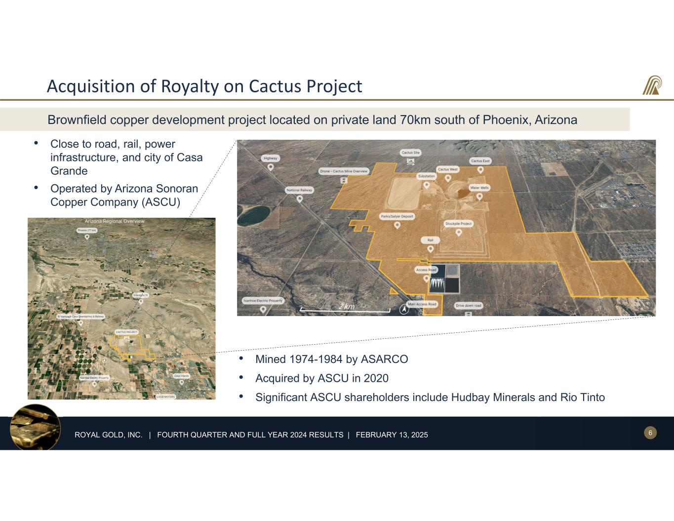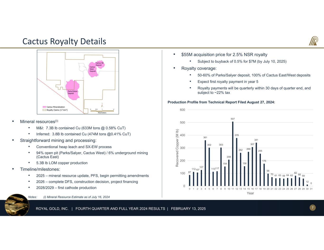 6ROYAL GOLD, INC. | FOURTH QUARTER AND FULL YEAR 2024 RESULTS | FEBRUARY 13, 2025 Acquisition of Royalty on Cactus Project • Close to road, rail, power infrastructure, and city of Casa Grande • Operated by Arizona Sonoran Copper Company (ASCU) Brownfield copper development project located on private land 70km south of Phoenix, Arizona • Mined 1974-1984 by ASARCO • Acquired by ASCU in 2020 • Significant ASCU shareholders include Hudbay Minerals and Rio Tinto