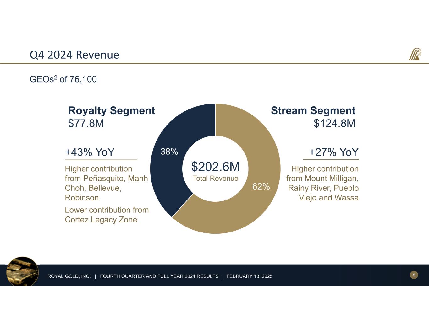 7ROYAL GOLD, INC. | FOURTH QUARTER AND FULL YEAR 2024 RESULTS | FEBRUARY 13, 2025 Cactus Royalty Details • $55M acquisition price for 2.5% NSR royalty • Subject to buyback of 0.5% for $7M (by July 10, 2025) • Royalty coverage: • 50-60% of Parks/Salyer deposit, 100% of Cactus East/West deposits • Expect first royalty payment in year 5 • Royalty payments will be quarterly within 30 days of quarter end, and subject to ~22% tax • Mineral resources(i): • M&I: 7.3B lb contained Cu (633M tons @ 0.58% CuT) • Inferred: 3.8B lb contained Cu (474M tons @0.41% CuT) • Straightforward mining and processing: • Conventional heap leach and SX-EW process • 94% open pit (Parks/Salyer, Cactus West) / 6% underground mining (Cactus East) • 5.3B lb LOM copper production • Timeline/milestones: • 2025 – mineral resource update, PFS, begin permitting amendments • 2026 – complete DFS, construction decision, project financing • 2028/2029 – first cathode production 87 112107 127 361 302 113117 303 154 208 507 378 262 156 269 307 341 255 176 98 70 61 63 59 64 62 82 68 59 12 0 0 100 200 300 400 500 600 0 1 2 3 4 5 6 7 8 9 10 11 12 13 14 15 16 17 18 19 20 21 22 23 24 25 26 27 28 29 30 31 R ec ov er ed C op pe r ( M lb ) Year Notes: (i) Mineral Resource Estimate as of July 16, 2024 Production Profile from Technical Report Filed August 27, 2024: