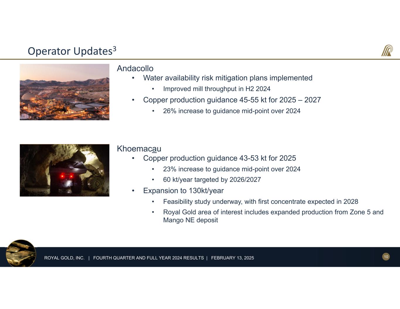 9ROYAL GOLD, INC. | FOURTH QUARTER AND FULL YEAR 2024 RESULTS | FEBRUARY 13, 2025 Operator Updates3 Cortez Complex • Near term production (100%) • 2025 guidance 680,000 – 765,000 oz • 2027 production >1M oz driven by Crossroads and Goldrush • Longer term growth projects • Robertson ROD received Q4 2024 • Fourmile PFS to start in 2025 • Continued exploration at Hanson and Swift Pueblo Viejo • 2025 gold production guidance 370,000 – 410,000 oz (60% Barrick share) • Recovery and throughput projects underway • Targeting 14M t/year in 2028; gold recovery to 90% by year end 2026 • Silver recovery improvement project targeted for Q4 2025 completion • El Naranjo tailings storage facility advancing • Commissioning targeted for late 2029 • Capacity for additional 8 years beyond 2046