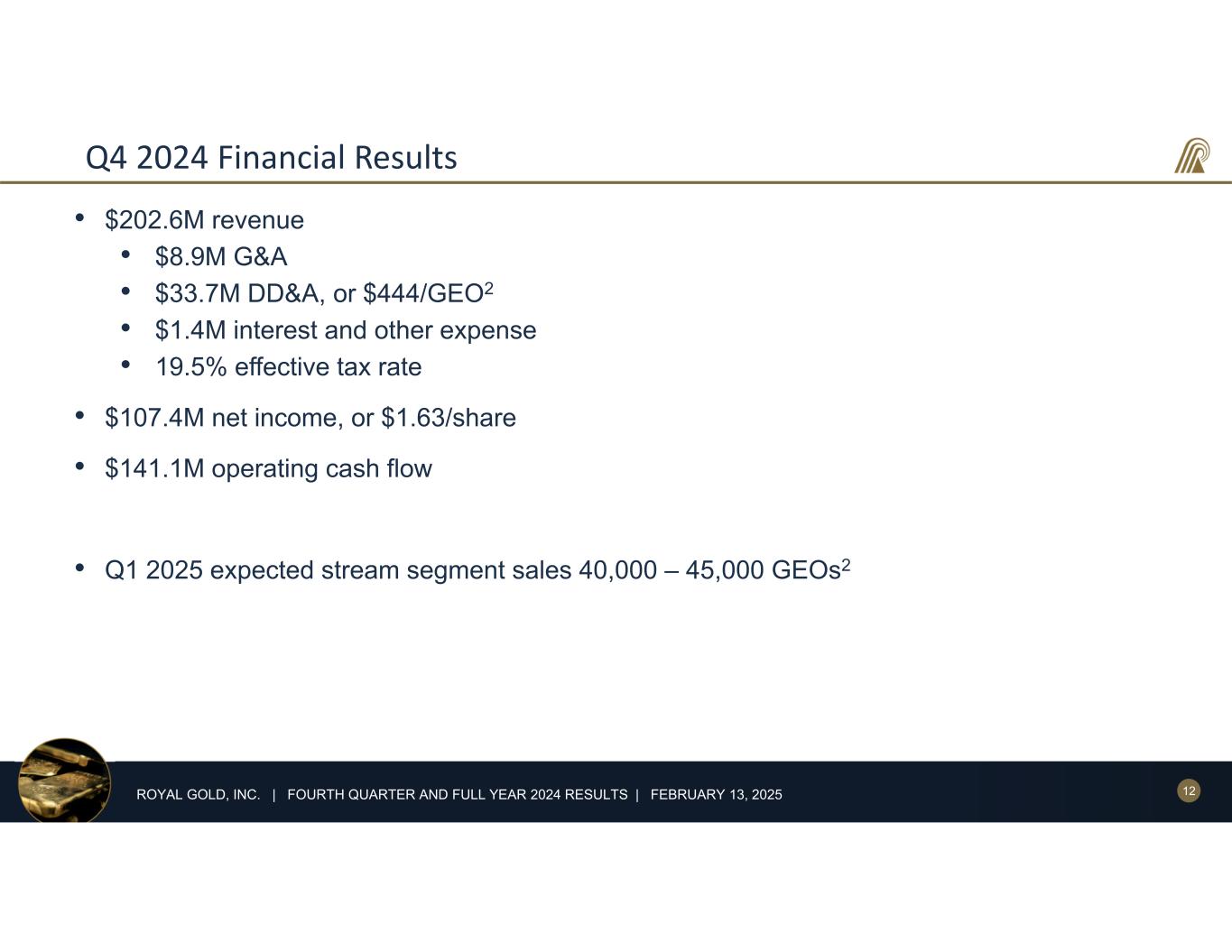 11ROYAL GOLD, INC. | FOURTH QUARTER AND FULL YEAR 2024 RESULTS | FEBRUARY 13, 2025 Q4 2024 Revenue * LBMA PM fixing price for gold, LBMA daily fixing price for silver, LME settlement price for copper. Gold Silver Copper Others AVERAGE METAL PRICES* $1,971 $2,663 Q4 '23 Q4 '24 Gold $23.20 $31.38 Q4 '23 Q4 '24 Silver $3.70 $4.17 Q4 '23 Q4 '24 Copper +35% +13%+35% TOTAL REVENUE Q4 '23 Q4 '24 GOLD 77% Q4 2024 REVENUE BY METAL $202.6M $152.7M 9% 10% SILVER COPPER +33%