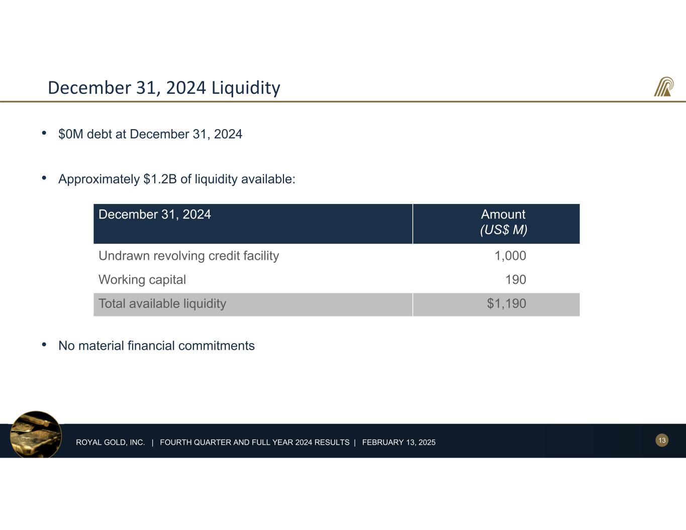 12ROYAL GOLD, INC. | FOURTH QUARTER AND FULL YEAR 2024 RESULTS | FEBRUARY 13, 2025 Q4 2024 Financial Results • $202.6M revenue • $8.9M G&A • $33.7M DD&A, or $444/GEO2 • $1.4M interest and other expense • 19.5% effective tax rate • $107.4M net income, or $1.63/share • $141.1M operating cash flow • Q1 2025 expected stream segment sales 40,000 – 45,000 GEOs2