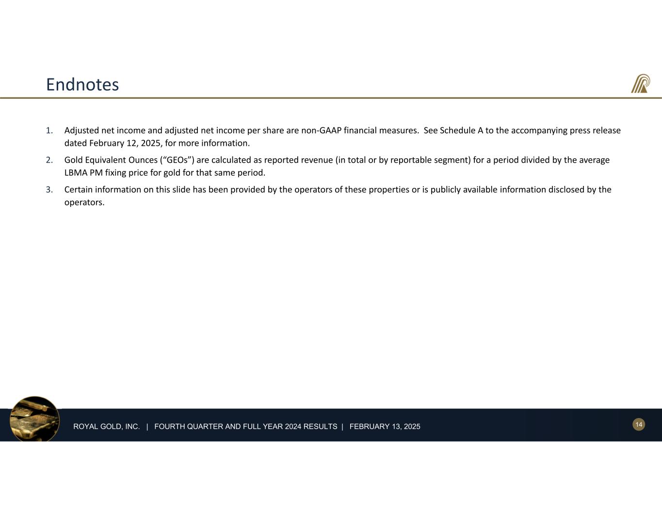 14ROYAL GOLD, INC. | FOURTH QUARTER AND FULL YEAR 2024 RESULTS | FEBRUARY 13, 2025 Endnotes 1. Adjusted net income and adjusted net income per share are non-GAAP financial measures. See Schedule A to the accompanying press release dated February 12, 2025, for more information. 2. Gold Equivalent Ounces (“GEOs”) are calculated as reported revenue (in total or by reportable segment) for a period divided by the average LBMA PM fixing price for gold for that same period. 3. Certain information on this slide has been provided by the operators of these properties or is publicly available information disclosed by the operators.