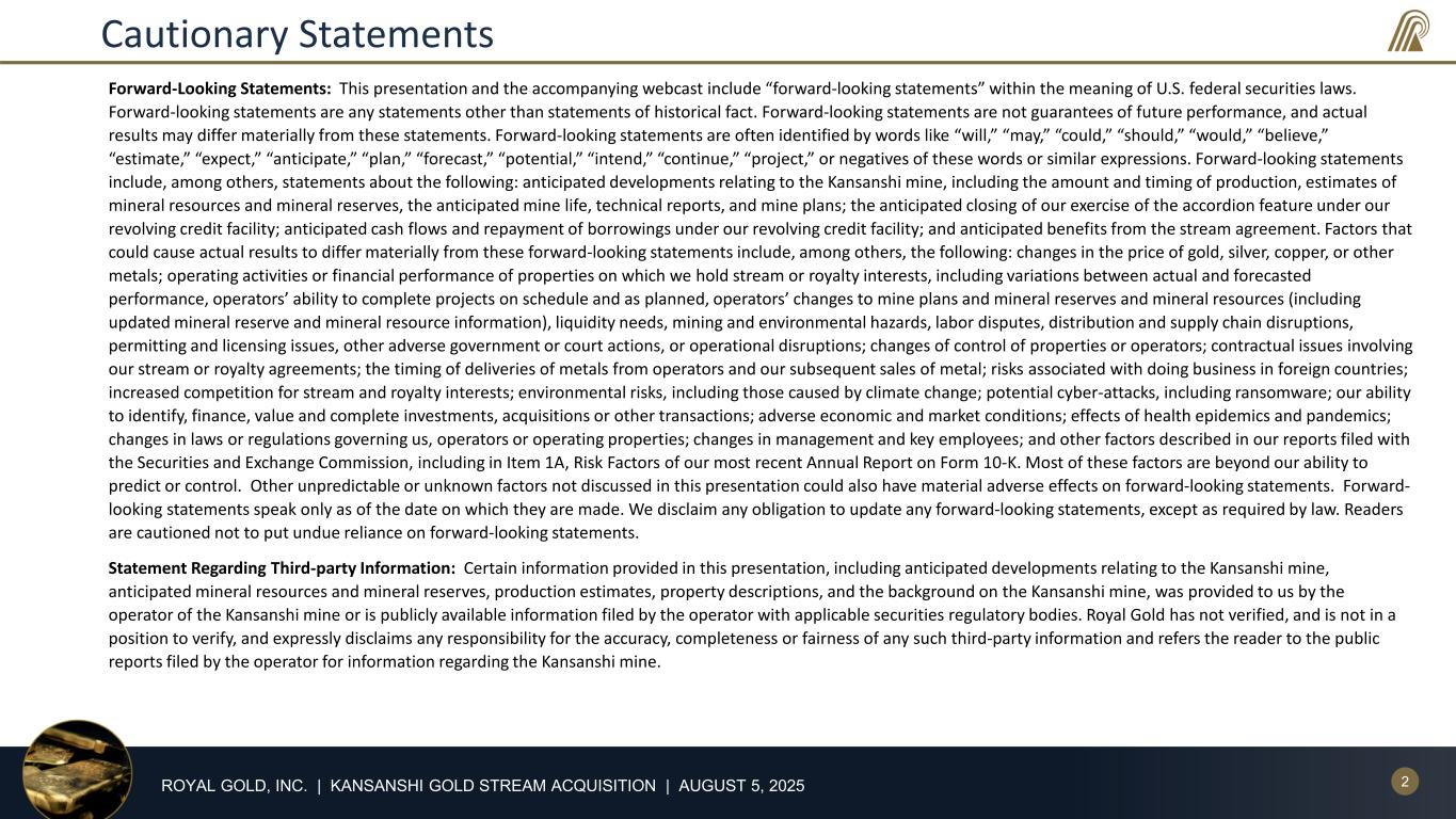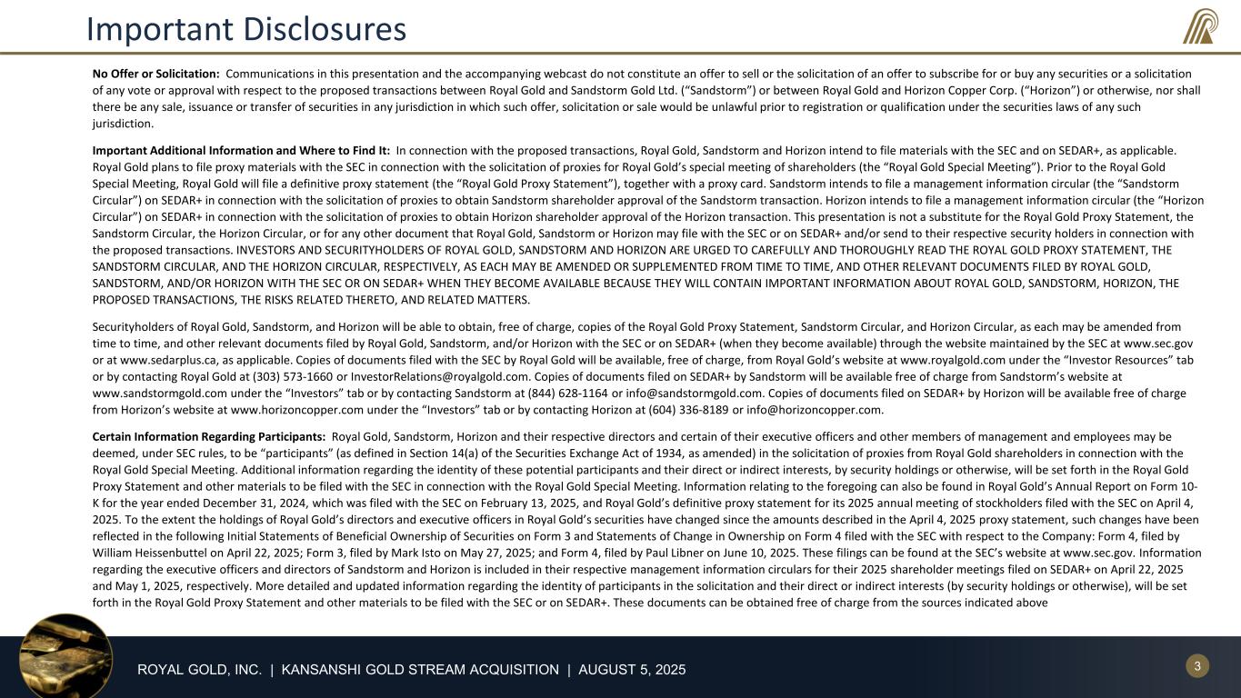 2ROYAL GOLD, INC. | KANSANSHI GOLD STREAM ACQUISITION | AUGUST 5, 2025 Cautionary Statements Forward-Looking Statements: This presentation and the accompanying webcast include “forward-looking statements” within the meaning of U.S. federal securities laws. Forward-looking statements are any statements other than statements of historical fact. Forward-looking statements are not guarantees of future performance, and actual results may differ materially from these statements. Forward-looking statements are often identified by words like “will,” “may,” “could,” “should,” “would,” “believe,” “estimate,” “expect,” “anticipate,” “plan,” “forecast,” “potential,” “intend,” “continue,” “project,” or negatives of these words or similar expressions. Forward-looking statements include, among others, statements about the following: anticipated developments relating to the Kansanshi mine, including the amount and timing of production, estimates of mineral resources and mineral reserves, the anticipated mine life, technical reports, and mine plans; the anticipated closing of our exercise of the accordion feature under our revolving credit facility; anticipated cash flows and repayment of borrowings under our revolving credit facility; and anticipated benefits from the stream agreement. Factors that could cause actual results to differ materially from these forward-looking statements include, among others, the following: changes in the price of gold, silver, copper, or other metals; operating activities or financial performance of properties on which we hold stream or royalty interests, including variations between actual and forecasted performance, operators’ ability to complete projects on schedule and as planned, operators’ changes to mine plans and mineral reserves and mineral resources (including updated mineral reserve and mineral resource information), liquidity needs, mining and environmental hazards, labor disputes, distribution and supply chain disruptions, permitting and licensing issues, other adverse government or court actions, or operational disruptions; changes of control of properties or operators; contractual issues involving our stream or royalty agreements; the timing of deliveries of metals from operators and our subsequent sales of metal; risks associated with doing business in foreign countries; increased competition for stream and royalty interests; environmental risks, including those caused by climate change; potential cyber-attacks, including ransomware; our ability to identify, finance, value and complete investments, acquisitions or other transactions; adverse economic and market conditions; effects of health epidemics and pandemics; changes in laws or regulations governing us, operators or operating properties; changes in management and key employees; and other factors described in our reports filed with the Securities and Exchange Commission, including in Item 1A, Risk Factors of our most recent Annual Report on Form 10-K. Most of these factors are beyond our ability to predict or control. Other unpredictable or unknown factors not discussed in this presentation could also have material adverse effects on forward-looking statements. Forward- looking statements speak only as of the date on which they are made. We disclaim any obligation to update any forward-looking statements, except as required by law. Readers are cautioned not to put undue reliance on forward-looking statements. Statement Regarding Third-party Information: Certain information provided in this presentation, including anticipated developments relating to the Kansanshi mine, anticipated mineral resources and mineral reserves, production estimates, property descriptions, and the background on the Kansanshi mine, was provided to us by the operator of the Kansanshi mine or is publicly available information filed by the operator with applicable securities regulatory bodies. Royal Gold has not verified, and is not in a position to verify, and expressly disclaims any responsibility for the accuracy, completeness or fairness of any such third-party information and refers the reader to the public reports filed by the operator for information regarding the Kansanshi mine.