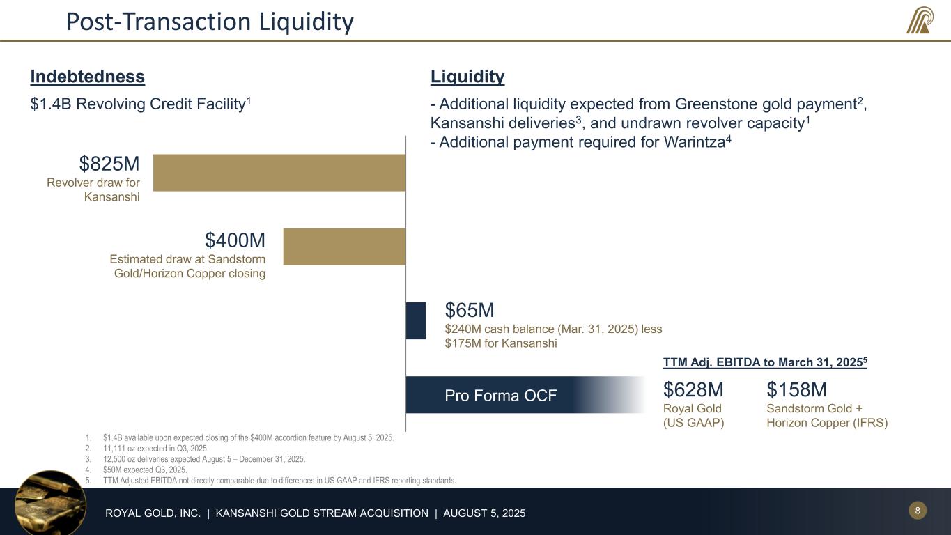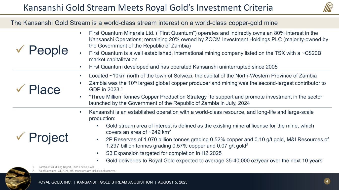 3ROYAL GOLD, INC. | KANSANSHI GOLD STREAM ACQUISITION | AUGUST 5, 2025 Important Disclosures No Offer or Solicitation: Communications in this presentation and the accompanying webcast do not constitute an offer to sell or the solicitation of an offer to subscribe for or buy any securities or a solicitation of any vote or approval with respect to the proposed transactions between Royal Gold and Sandstorm Gold Ltd. (“Sandstorm”) or between Royal Gold and Horizon Copper Corp. (“Horizon”) or otherwise, nor shall there be any sale, issuance or transfer of securities in any jurisdiction in which such offer, solicitation or sale would be unlawful prior to registration or qualification under the securities laws of any such jurisdiction. Important Additional Information and Where to Find It: In connection with the proposed transactions, Royal Gold, Sandstorm and Horizon intend to file materials with the SEC and on SEDAR+, as applicable. Royal Gold plans to file proxy materials with the SEC in connection with the solicitation of proxies for Royal Gold’s special meeting of shareholders (the “Royal Gold Special Meeting”). Prior to the Royal Gold Special Meeting, Royal Gold will file a definitive proxy statement (the “Royal Gold Proxy Statement”), together with a proxy card. Sandstorm intends to file a management information circular (the “Sandstorm Circular”) on SEDAR+ in connection with the solicitation of proxies to obtain Sandstorm shareholder approval of the Sandstorm transaction. Horizon intends to file a management information circular (the “Horizon Circular”) on SEDAR+ in connection with the solicitation of proxies to obtain Horizon shareholder approval of the Horizon transaction. This presentation is not a substitute for the Royal Gold Proxy Statement, the Sandstorm Circular, the Horizon Circular, or for any other document that Royal Gold, Sandstorm or Horizon may file with the SEC or on SEDAR+ and/or send to their respective security holders in connection with the proposed transactions. INVESTORS AND SECURITYHOLDERS OF ROYAL GOLD, SANDSTORM AND HORIZON ARE URGED TO CAREFULLY AND THOROUGHLY READ THE ROYAL GOLD PROXY STATEMENT, THE SANDSTORM CIRCULAR, AND THE HORIZON CIRCULAR, RESPECTIVELY, AS EACH MAY BE AMENDED OR SUPPLEMENTED FROM TIME TO TIME, AND OTHER RELEVANT DOCUMENTS FILED BY ROYAL GOLD, SANDSTORM, AND/OR HORIZON WITH THE SEC OR ON SEDAR+ WHEN THEY BECOME AVAILABLE BECAUSE THEY WILL CONTAIN IMPORTANT INFORMATION ABOUT ROYAL GOLD, SANDSTORM, HORIZON, THE PROPOSED TRANSACTIONS, THE RISKS RELATED THERETO, AND RELATED MATTERS. Securityholders of Royal Gold, Sandstorm, and Horizon will be able to obtain, free of charge, copies of the Royal Gold Proxy Statement, Sandstorm Circular, and Horizon Circular, as each may be amended from time to time, and other relevant documents filed by Royal Gold, Sandstorm, and/or Horizon with the SEC or on SEDAR+ (when they become available) through the website maintained by the SEC at www.sec.gov or at www.sedarplus.ca, as applicable. Copies of documents filed with the SEC by Royal Gold will be available, free of charge, from Royal Gold’s website at www.royalgold.com under the “Investor Resources” tab or by contacting Royal Gold at (303) 573-1660 or InvestorRelations@royalgold.com. Copies of documents filed on SEDAR+ by Sandstorm will be available free of charge from Sandstorm’s website at www.sandstormgold.com under the “Investors” tab or by contacting Sandstorm at (844) 628-1164 or info@sandstormgold.com. Copies of documents filed on SEDAR+ by Horizon will be available free of charge from Horizon’s website at www.horizoncopper.com under the “Investors” tab or by contacting Horizon at (604) 336-8189 or info@horizoncopper.com. Certain Information Regarding Participants: Royal Gold, Sandstorm, Horizon and their respective directors and certain of their executive officers and other members of management and employees may be deemed, under SEC rules, to be “participants” (as defined in Section 14(a) of the Securities Exchange Act of 1934, as amended) in the solicitation of proxies from Royal Gold shareholders in connection with the Royal Gold Special Meeting. Additional information regarding the identity of these potential participants and their direct or indirect interests, by security holdings or otherwise, will be set forth in the Royal Gold Proxy Statement and other materials to be filed with the SEC in connection with the Royal Gold Special Meeting. Information relating to the foregoing can also be found in Royal Gold’s Annual Report on Form 10- K for the year ended December 31, 2024, which was filed with the SEC on February 13, 2025, and Royal Gold’s definitive proxy statement for its 2025 annual meeting of stockholders filed with the SEC on April 4, 2025. To the extent the holdings of Royal Gold’s directors and executive officers in Royal Gold’s securities have changed since the amounts described in the April 4, 2025 proxy statement, such changes have been reflected in the following Initial Statements of Beneficial Ownership of Securities on Form 3 and Statements of Change in Ownership on Form 4 filed with the SEC with respect to the Company: Form 4, filed by William Heissenbuttel on April 22, 2025; Form 3, filed by Mark Isto on May 27, 2025; and Form 4, filed by Paul Libner on June 10, 2025. These filings can be found at the SEC’s website at www.sec.gov. Information regarding the executive officers and directors of Sandstorm and Horizon is included in their respective management information circulars for their 2025 shareholder meetings filed on SEDAR+ on April 22, 2025 and May 1, 2025, respectively. More detailed and updated information regarding the identity of participants in the solicitation and their direct or indirect interests (by security holdings or otherwise), will be set forth in the Royal Gold Proxy Statement and other materials to be filed with the SEC or on SEDAR+. These documents ca