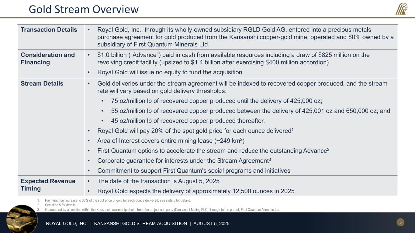 4ROYAL GOLD, INC. | KANSANSHI GOLD STREAM ACQUISITION | AUGUST 5, 2025  People • First Quantum Minerals Ltd. (“First Quantum”) operates and indirectly owns an 80% interest in the Kansanshi Operations; remaining 20% owned by ZCCM Investment Holdings PLC (majority-owned by the Government of the Republic of Zambia) • First Quantum is a well established, international mining company listed on the TSX with a ~C$20B market capitalization • First Quantum developed and has operated Kansanshi uninterrupted since 2005  Place • Located ~10km north of the town of Solwezi, the capital of the North-Western Province of Zambia • Zambia was the 10th largest global copper producer and mining was the second-largest contributor to GDP in 2023.1 • “Three Million Tonnes Copper Production Strategy” to support and promote investment in the sector launched by the Government of the Republic of Zambia in July, 2024  Project • Kansanshi is an established operation with a world-class resource, and long-life and large-scale production: • Gold stream area of interest is defined as the existing mineral license for the mine, which covers an area of ~249 km2 • 2P Reserves of 1.070 billion tonnes grading 0.52% copper and 0.10 g/t gold, M&I Resources of 1.297 billion tonnes grading 0.57% copper and 0.07 g/t gold2 • S3 Expansion targeted for completion in H2 2025 • Gold deliveries to Royal Gold expected to average 35-40,000 oz/year over the next 10 years Kansanshi Gold Stream Meets Royal Gold’s Investment Criteria The Kansanshi Gold Stream is a world-class stream interest on a world-class copper-gold mine 1. Zambia 2024 Mining Report, Third Edition, PwC. 2. As of December 31, 2024, M&I resources are inclusive of reserves.
