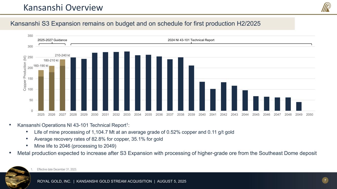 6ROYAL GOLD, INC. | KANSANSHI GOLD STREAM ACQUISITION | AUGUST 5, 2025 Gold Stream Overview • Gold stream is life of mine • First Quantum acceleration options: 1. From the earliest achievement by First Quantum of either: • minimum ‘BB’ or equivalent senior unsecured debt rating from a rating agency, or • Net Debt/EBITDA ratio of 2.25x or less over three consecutive quarters starting from March 31, 2026  it will have a one-year period to exercise the option and deliver gold worth up to $200 million over a 14-month period from the date of option exercise and reduce the stream rates and delivery thresholds by up to 20% 2. If First Quantum achieves either: • minimum ‘BBB-’ or equivalent senior unsecured debt rating from a rating agency, or • Net Debt/EBITDA ratio of 1.25x or less over four consecutive quarters, and • compliance with certain other operational conditions  it will have a one-year period to exercise the option and deliver gold worth up to $100 million over a 7-month period from the date of option exercise and reduce the stream rates and delivery thresholds by up to a further 10% • Cash price per ounce delivered: • 20% of the spot gold price • 35% of the spot gold price should one of the conditions in Acceleration Option 1 be met Gold stream provides life of mine exposure to a large, long-life copper-gold mine Kansanshi Operations and Area of Interest: