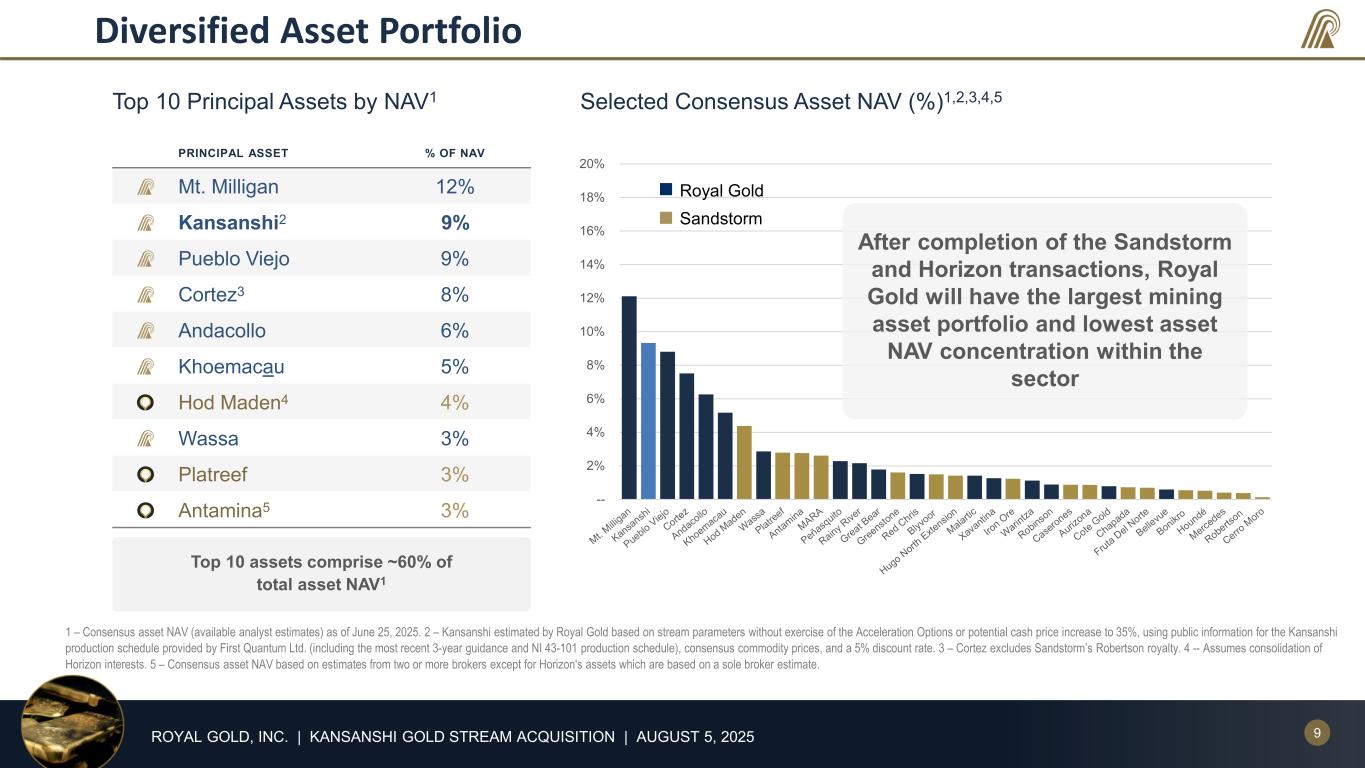 8ROYAL GOLD, INC. | KANSANSHI GOLD STREAM ACQUISITION | AUGUST 5, 2025 Post-Transaction Liquidity $825M Revolver draw for Kansanshi $400M Estimated draw at Sandstorm Gold/Horizon Copper closing $65M $240M cash balance (Mar. 31, 2025) less $175M for Kansanshi TTM Adj. EBITDA to March 31, 20255 $628M Royal Gold (US GAAP) $158M Sandstorm Gold + Horizon Copper (IFRS) Indebtedness Liquidity Pro Forma OCF $1.4B Revolving Credit Facility1 - Additional liquidity expected from Greenstone gold payment2, Kansanshi deliveries3, and undrawn revolver capacity1 - Additional payment required for Warintza4 1. $1.4B available upon expected closing of the $400M accordion feature by August 5, 2025. 2. 11,111 oz expected in Q3, 2025. 3. 12,500 oz deliveries expected August 5 – December 31, 2025. 4. $50M expected Q3, 2025. 5. TTM Adjusted EBITDA not directly comparable due to differences in US GAAP and IFRS reporting standards.