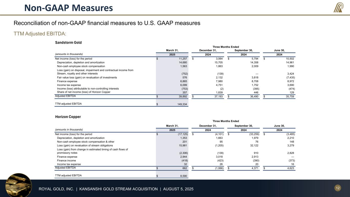11ROYAL GOLD, INC. | KANSANSHI GOLD STREAM ACQUISITION | AUGUST 5, 2025 Non-GAAP Measures Reconciliation of non-GAAP financial measures to U.S. GAAP measures TTM Adjusted EBITDA: Royal Gold (amounts in thousands) Net income and comprehensive income $ 113,578 $ 107,521 $ 96,330 $ 81,320 Depreciation, depletion and amortization 32,995 33,737 36,177 35,747 Non-cash employee stock compensation 3,198 2,579 2,977 3,348 Fair value changes in equity securities 37 24 425 63 Interest and other, net (893) (179) 581 1,709 Income tax expense 10,389 26,078 21,510 18,991 Non-controlling interests in operating income of consolidated subsidiaries (80) (113) (88) (112) Adjusted EBITDA $ 159,224 $ 169,647 $ 157,912 $ 141,066 TTM adjusted EBITDA $ 627,849 2025 2024 2024 2024 Three Months Ended March 31, December 31, September 30, June 30,