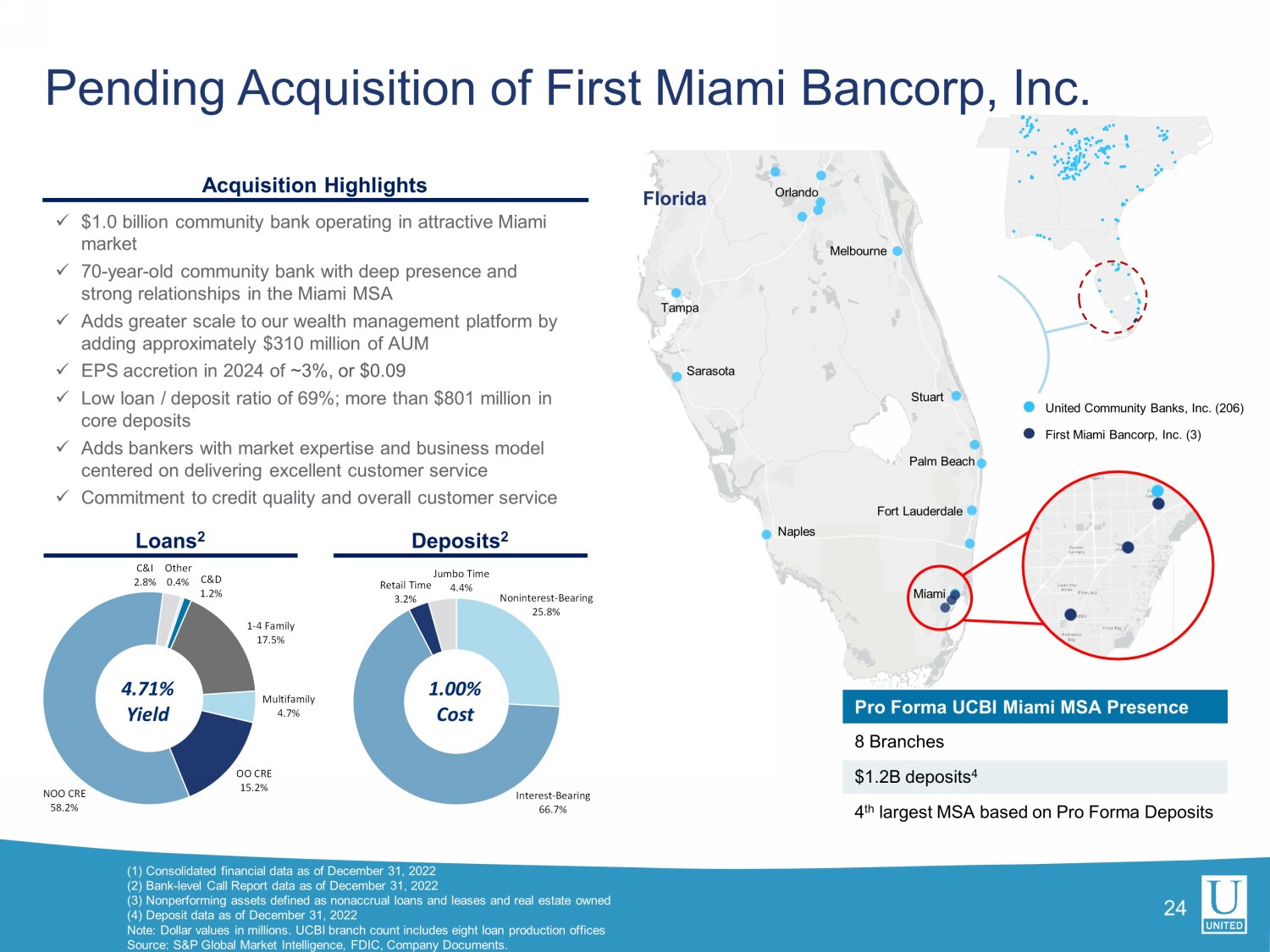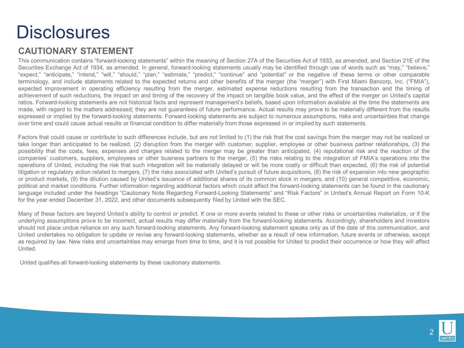 Disclosures 2 CAUTIONARY STATEMENT This communication contains “forward - looking statements” within the meaning of Section 27 A of the Securities Act of 1933 , as amended, and Section 21 E of the Securities Exchange Act of 1934 , as amended . In general, forward - looking statements usually may be identified through use of words such as “may,” “believe,” “expect,” “anticipate,” “intend,” “will,” “should,” “plan,” “estimate,” “predict,” “continue” and “potential” or the negative of these terms or other comparable terminology, and include statements related to the expected returns and other benefits of the merger (the “merger”) with First Miami Bancorp, Inc . (“FMIA”), expected improvement in operating efficiency resulting from the merger, estimated expense reductions resulting from the transaction and the timing of achievement of such reductions, the impact on and timing of the recovery of the impact on tangible book value, and the effect of the merger on United’s capital ratios . Forward - looking statements are not historical facts and represent management’s beliefs, based upon information available at the time the statements are made, with regard to the matters addressed; they are not guarantees of future performance . Actual results may prove to be materially different from the results expressed or implied by the forward - looking statements . Forward - looking statements are subject to numerous assumptions, risks and uncertainties that change over time and could cause actual results or financial condition to differ materially from those expressed in or implied by such statements . Factors that could cause or contribute to such differences include, but are not limited to ( 1 ) the risk that the cost savings from the merger may not be realized or take longer than anticipated to be realized, ( 2 ) disruption from the merger with customer, supplier, employee or other business partner relationships, ( 3 ) the possibility that the costs, fees, expenses and charges related to the merger may be greater than anticipated, ( 4 ) reputational risk and the reaction of the companies’ customers, suppliers, employees or other business partners to the merger, ( 5 ) the risks relating to the integration of FMIA’s operations into the operations of United, including the risk that such integration will be materially delayed or will be more costly or difficult than expected, ( 6 ) the risk of potential litigation or regulatory action related to mergers, ( 7 ) the risks associated with United’s pursuit of future acquisitions, ( 8 ) the risk of expansion into new geographic or product markets, ( 9 ) the dilution caused by United’s issuance of additional shares of its common stock in mergers, and ( 10 ) general competitive, economic, political and market conditions . Further information regarding additional factors which could affect the forward - looking statements can be found in the cautionary language included under the headings “Cautionary Note Regarding Forward - Looking Statements” and “Risk Factors” in United’s Annual Report on Form 10 - K for the year ended December 31 , 2022 , and other documents subsequently filed by United with the SEC . Many of these factors are beyond United’s ability to control or predict . If one or more events related to these or other risks or uncertainties materialize, or if the underlying assumptions prove to be incorrect, actual results may differ materially from the forward - looking statements . Accordingly, shareholders and investors should not place undue reliance on any such forward - looking statements . Any forward - looking statement speaks only as of the date of this communication, and United undertakes no obligation to update or revise any forward - looking statements, whether as a result of new information, future events or otherwise, except as required by law . New risks and uncertainties may emerge from time to time, and it is not possible for United to predict their occurrence or how they will affect United . United qualifies all forward - looking statements by these cautionary statements .