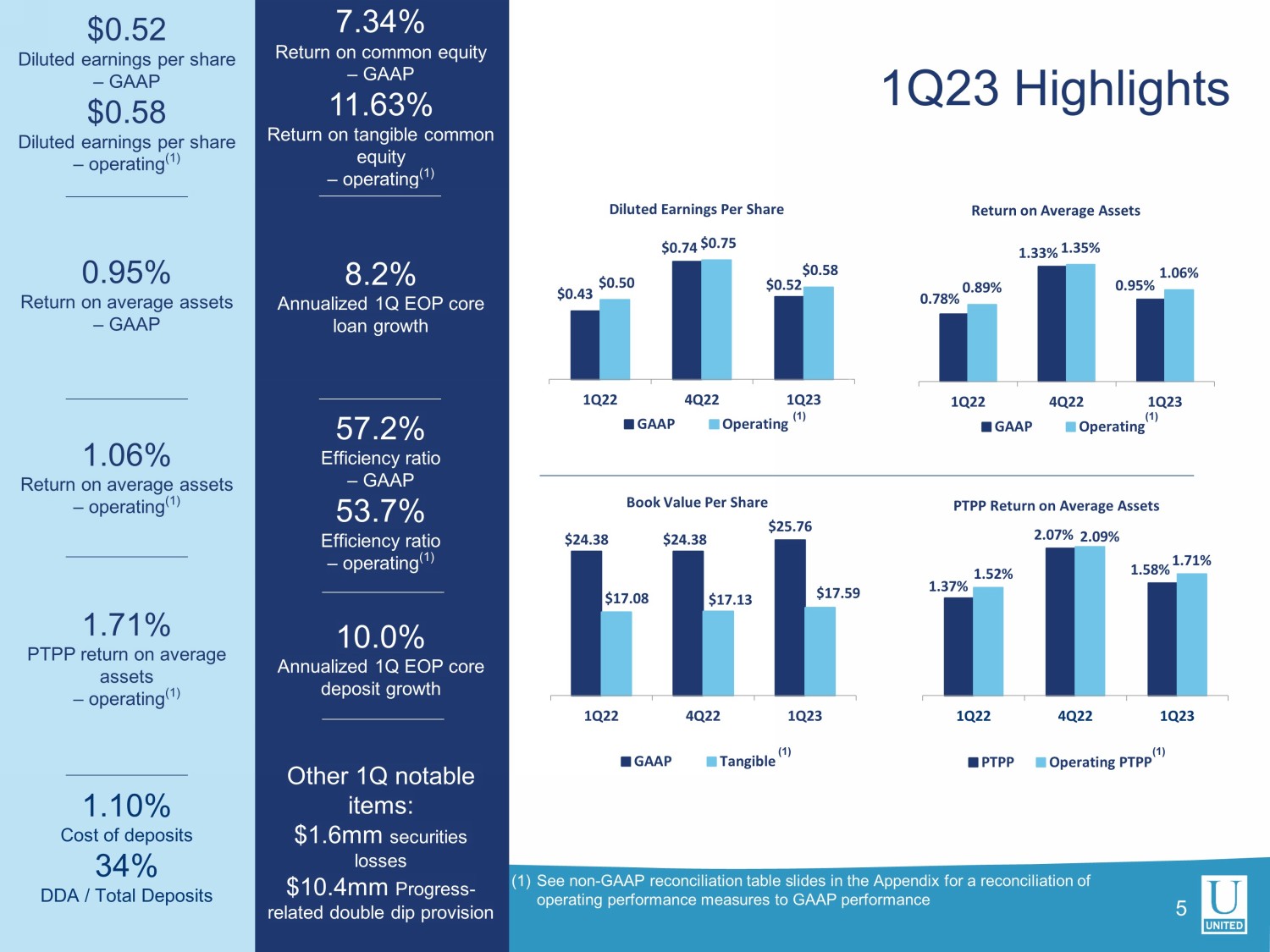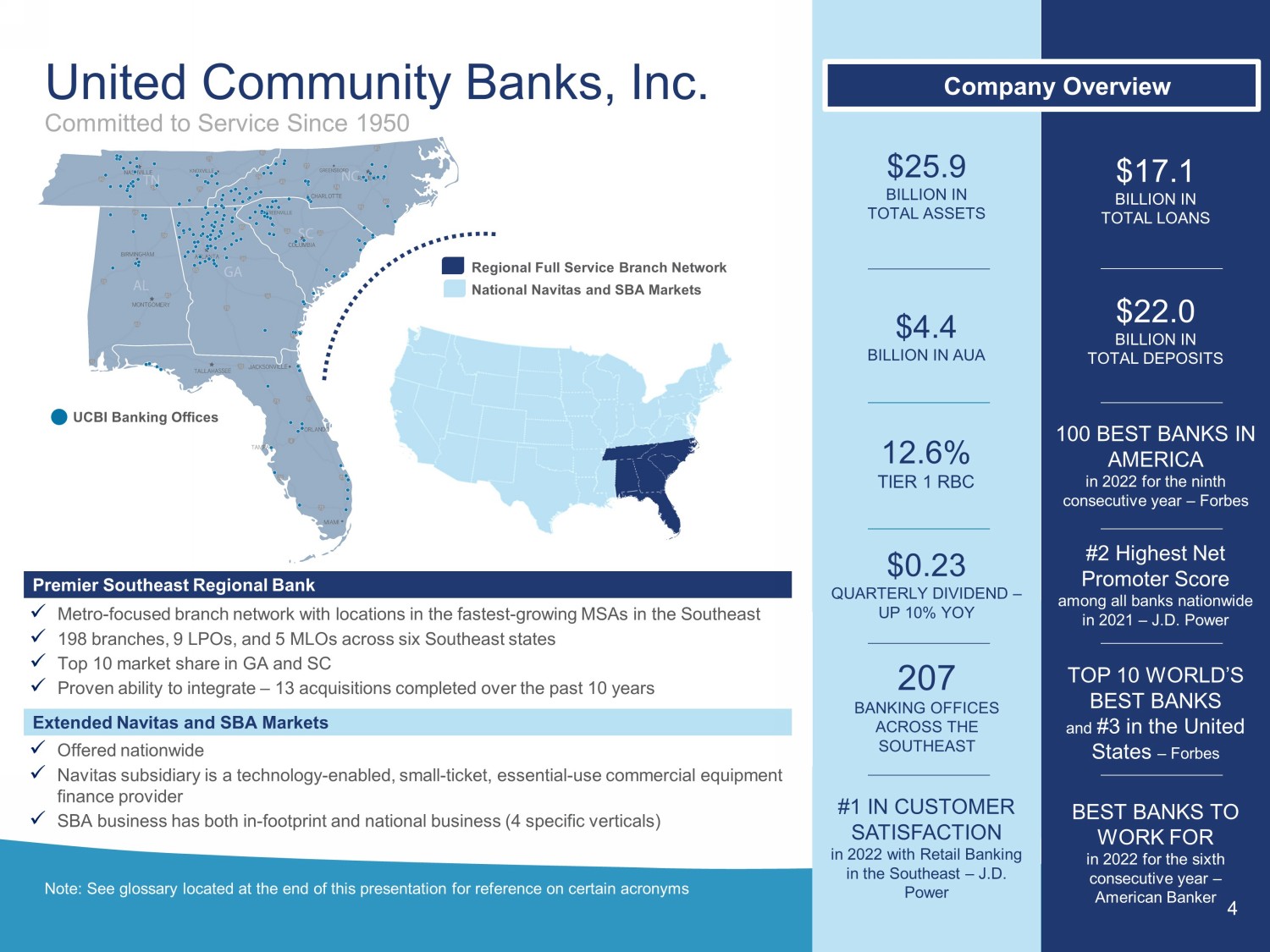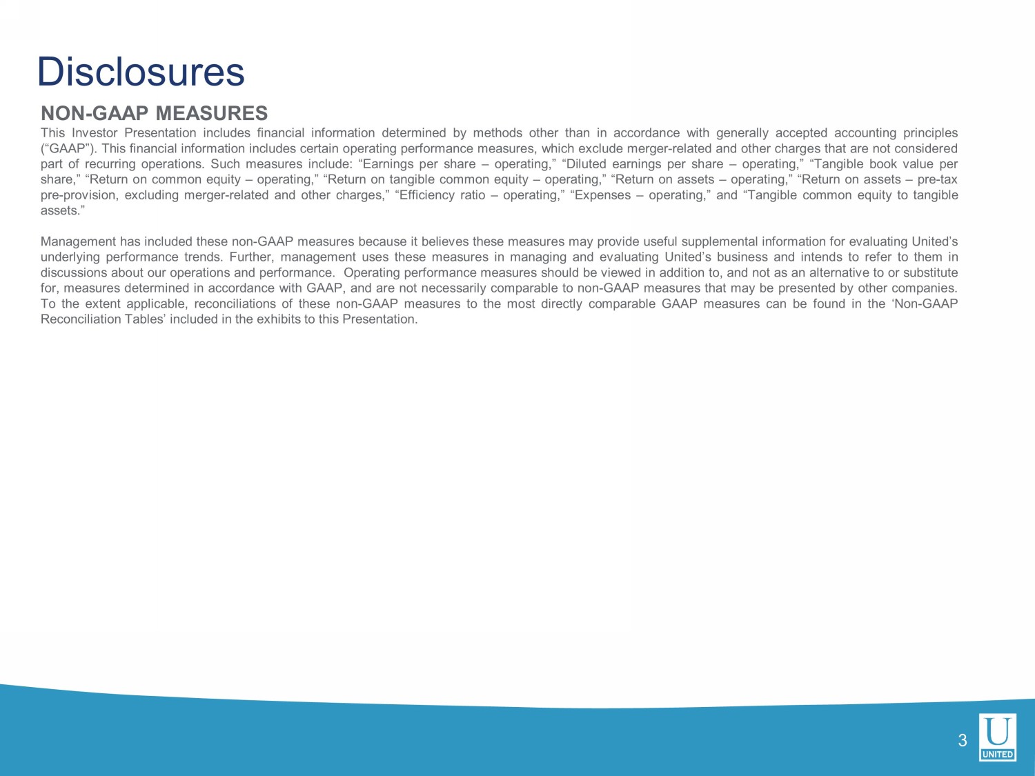 Disclosures 3 NON - GAAP MEASURES This Investor Presentation includes financial information determined by methods other than in accordance with generally accepted accounting principles (“GAAP”) . This financial information includes certain operating performance measures, which exclude merger - related and other charges that are not considered part of recurring operations . Such measures include : “Earnings per share – operating,” “Diluted earnings per share – operating,” “Tangible book value per share,” “Return on common equity – operating,” “Return on tangible common equity – operating,” “Return on assets – operating,” “Return on assets – pre - tax pre - provision, excluding merger - related and other charges,” “Efficiency ratio – operating,” “Expenses – operating,” and “Tangible common equity to tangible assets . ” Management has included these non - GAAP measures because it believes these measures may provide useful supplemental information for evaluating United’s underlying performance trends . Further, management uses these measures in managing and evaluating United’s business and intends to refer to them in discussions about our operations and performance . Operating performance measures should be viewed in addition to, and not as an alternative to or substitute for, measures determined in accordance with GAAP, and are not necessarily comparable to non - GAAP measures that may be presented by other companies . To the extent applicable, reconciliations of these non - GAAP measures to the most directly comparable GAAP measures can be found in the ‘Non - GAAP Reconciliation Tables’ included in the exhibits to this Presentation .