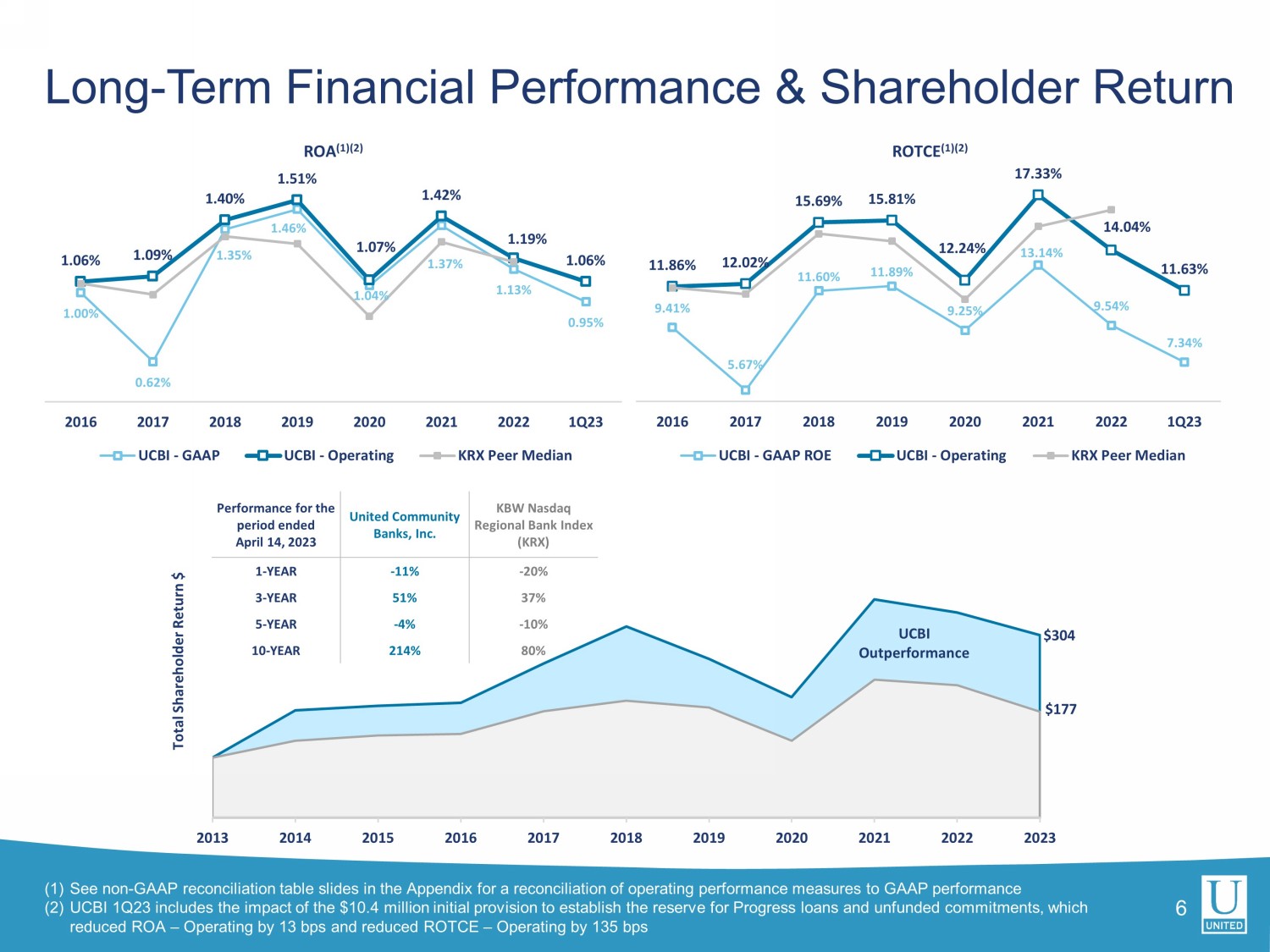 $24.38 $24.38 $25.76 $17.08 $17.13 $17.59 1Q22 4Q22 1Q23 Book Value Per Share GAAP Tangible 10.0% Annualized 1Q EOP core deposit growth 7.34% Return on common equity – GAAP 11.63% Return on tangible common equity – operating (1) Other 1Q notable items: $1.6mm securities losses $10.4mm Progress - related double dip provision $0.52 Diluted earnings per share – GAAP $0.58 Diluted earnings per share – operating (1) 0.95% Return on average assets – GAAP 1.06% Return on average assets – operating (1) 1.71% PTPP return on average assets – operating (1) 1.10% Cost of deposits 34% DDA / Total Deposits 1Q23 Highlights (1) See non - GAAP reconciliation table slides in the Appendix for a reconciliation of operating performance measures to GAAP performance $0.43 $0.74 $0.52 $0.50 $0.75 $0.58 1Q22 4Q22 1Q23 Diluted Earnings Per Share GAAP Operating (1) 0.78% 1.33% 0.95% 0.89% 1.35% 1.06% 1Q22 4Q22 1Q23 Return on Average Assets GAAP Operating 1.37% 2.07% 1.58% 1.52% 2.09% 1.71% 1Q22 4Q22 1Q23 PTPP Return on Average Assets PTPP Operating PTPP (1) (1) 8.2% Annualized 1Q EOP core loan growth 57.2% Efficiency ratio – GAAP 53.7% Efficiency ratio – operating (1) 5 (1)