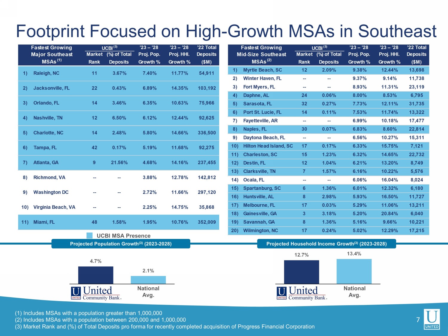 6 (1) See non - GAAP reconciliation table slides in the Appendix for a reconciliation of operating performance measures to GAAP performa nce (2) UCBI 1Q23 includes the impact of the $10.4 million initial provision to establish the reserve for Progress loans and unfunded co mmitments, which reduced ROA – Operating by 13 bps and reduced ROTCE – Operating by 135 bps Long - Term Financial Performance & Shareholder Return 1.00% 0.62% 1.35% 1.46% 1.04% 1.37% 1.13% 0.95% 1.06% 1.09% 1.40% 1.51% 1.07% 1.42% 1.19% 1.06% 2016 2017 2018 2019 2020 2021 2022 1Q23 ROA (1)(2) UCBI - GAAP UCBI - Operating KRX Peer Median 9.41% 5.67% 11.60% 11.89% 9.25% 13.14% 9.54% 7.34% 11.86% 12.02% 15.69% 15.81% 12.24% 17.33% 14.04% 11.63% 2016 2017 2018 2019 2020 2021 2022 1Q23 ROTCE (1)(2) UCBI - GAAP ROE UCBI - Operating KRX Peer Median $304 $177 2013 2014 2015 2016 2017 2018 2019 2020 2021 2022 2023 Total Shareholder Return $ UCBI Outperformance Performance for the period ended April 14, 2023 United Community Banks, Inc. KBW Nasdaq Regional Bank Index (KRX) 1 - YEAR - 11% - 20% 3 - YEAR 51% 37% 5 - YEAR - 4% - 10% 10 - YEAR 214% 80%