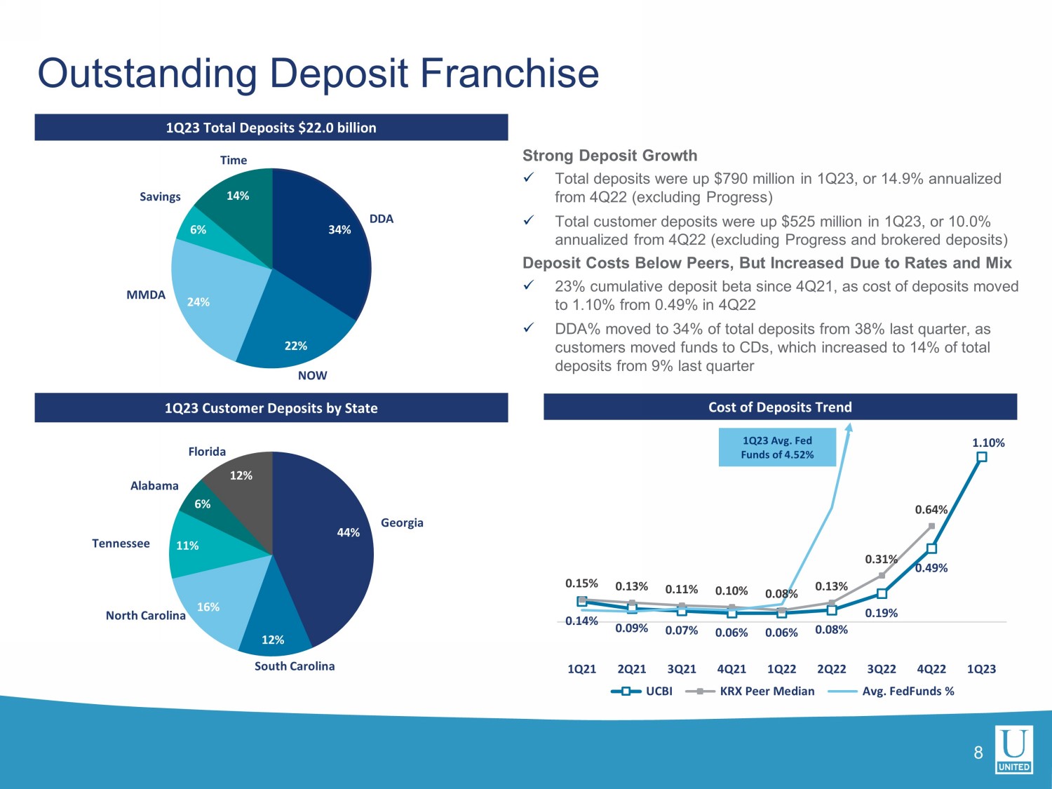4.7% 2.1% 12.7% 13.4% 1 2 Fastest Growing UCBI (3) ’23 – ’28 ’23 – ’28 ’22 Total Major Southeast Market (%) of Total Proj. Pop. Proj. HHI. Deposits MSAs (1) Rank Deposits Growth % Growth % ($M) 1) Raleigh, NC 11 3.67% 7.40% 11.77% 54,911 2) Jacksonville, FL 22 0.43% 6.89% 14.35% 103,192 3) Orlando, FL 14 3.46% 6.35% 10.63% 75,966 4) Nashville, TN 12 6.50% 6.12% 12.44% 92,625 5) Charlotte, NC 14 2.48% 5.80% 14.66% 336,500 6) Tampa, FL 42 0.17% 5.19% 11.68% 92,275 7) Atlanta, GA 9 21.56% 4.68% 14.16% 237,455 8) Richmond, VA -- -- 3.88% 12.78% 142,812 9) Washington DC -- -- 2.72% 11.66% 297,120 10) Virginia Beach, VA -- -- 2.25% 14.75% 35,868 11) Miami, FL 48 1.58% 1.95% 10.76% 352,009 Fastest Growing UCBI (3) ’23 – ’28 ’23 – ’28 ’22 Total Mid-Size Southeast Market (%) of Total Proj. Pop. Proj. HHI. Deposits MSAs (2) Rank Deposits Growth % Growth % ($M) 1) Myrtle Beach, SC 12 2.09% 9.38% 12.44% 13,698 2) Winter Haven, FL -- -- 9.37% 9.14% 11,738 3) Fort Myers, FL -- -- 8.93% 11.31% 23,119 4) Daphne, AL 24 0.06% 8.00% 8.53% 6,795 5) Sarasota, FL 32 0.27% 7.73% 12.11% 31,735 6) Port St. Lucie, FL 14 0.11% 7.53% 11.74% 13,322 7) Fayetteville, AR -- -- 6.99% 10.18% 17,477 8) Naples, FL 30 0.07% 6.83% 8.60% 22,814 9) Daytona Beach, FL -- -- 6.56% 10.27% 15,311 10) Hilton Head Island, SC 17 0.17% 6.33% 15.75% 7,121 11) Charleston, SC 15 1.23% 6.32% 14.65% 22,732 12) Destin, FL 12 1.04% 6.21% 13.20% 8,749 13) Clarksville, TN 7 1.57% 6.16% 10.22% 5,576 14) Ocala, FL -- -- 6.06% 16.04% 8,024 15) Spartanburg, SC 6 1.36% 6.01% 12.32% 6,180 16) Huntsville, AL 8 2.98% 5.93% 16.50% 11,727 17) Melbourne, FL 17 0.03% 5.29% 11.06% 13,211 18) Gainesville, GA 3 3.18% 5.20% 20.84% 6,040 19) Savannah, GA 8 1.36% 5.16% 9.66% 10,221 20) Wilmington, NC 17 0.24% 5.02% 12.29% 17,215 UCBI MSA Presence 7 (1) Includes MSAs with a population greater than 1,000,000 (2) Includes MSAs with a population between 200,000 and 1,000,000 (3) Market Rank and (%) of Total Deposits pro forma for recently completed acquisition of Progress Financial Corporation Projected Population Growth (3) (2023 - 2028) Projected Household Income Growth (3) (2023 - 2028) National Avg. National Avg. Footprint Focused on High - Growth MSAs in Southeast