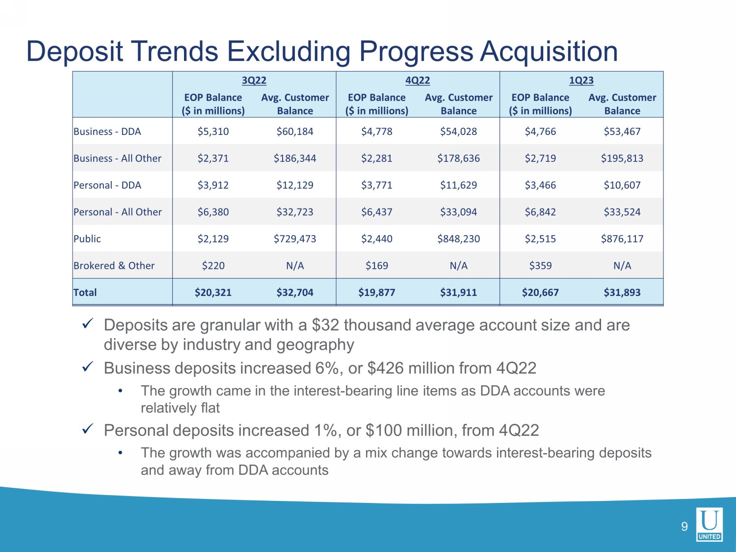 34% 22% 24% 6% 14% DDA MMDA Savings Time NOW Outstanding Deposit Franchise 8 1Q23 Total Deposits $22.0 billion 1Q23 Customer Deposits by State Cost of Deposits Trend North Carolina 0.14% 0.09% 0.07% 0.06% 0.06% 0.08% 0.19% 0.49% 1.10% 0.15% 0.13% 0.11% 0.10% 0.08% 0.13% 0.31% 0.64% 1Q21 2Q21 3Q21 4Q21 1Q22 2Q22 3Q22 4Q22 1Q23 UCBI KRX Peer Median Avg. FedFunds % 1Q23 Avg. Fed Funds of 4.52% Strong Deposit Growth x Total deposits were up $790 million in 1Q23, or 14.9% annualized from 4Q22 (excluding Progress) x Total customer deposits were up $525 million in 1Q23, or 10.0% annualized from 4Q22 (excluding Progress and brokered deposits) Deposit Costs Below Peers, But Increased Due to Rates and Mix x 23% cumulative deposit beta since 4Q21, as cost of deposits moved to 1.10% from 0.49% in 4Q22 x DDA% moved to 34% of total deposits from 38% last quarter, as customers moved funds to CDs, which increased to 14% of total deposits from 9% last quarter 44% 12% 16% 11% 6% 12% Georgia South Carolina Tennessee Alabama Florida