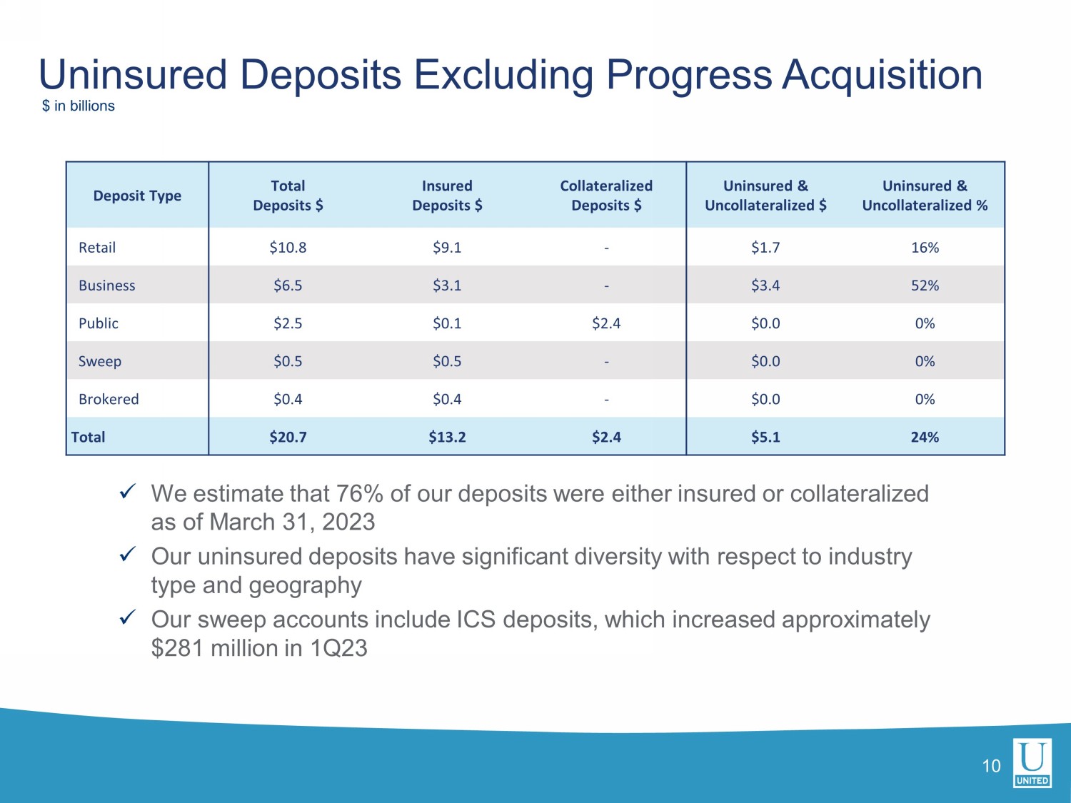 Deposit Trends Excluding Progress Acquisition 9 x Deposits are granular with a $32 thousand average account size and are diverse by industry and geography x Business deposits increased 6%, or $426 million from 4Q22 • The growth came in the interest - bearing line items as DDA accounts were relatively flat x Personal deposits increased 1%, or $100 million, from 4Q22 • The growth was accompanied by a mix change towards interest - bearing deposits and away from DDA accounts 3Q22 4Q22 1Q23 EOP Balance ($ in millions) Avg. Customer Balance EOP Balance ($ in millions) Avg. Customer Balance EOP Balance ($ in millions) Avg. Customer Balance Business - DDA $5,310 $60,184 $4,778 $54,028 $4,766 $53,467 Business - All Other $2,371 $186,344 $2,281 $178,636 $2,719 $195,813 Personal - DDA $3,912 $12,129 $3,771 $11,629 $3,466 $10,607 Personal - All Other $6,380 $32,723 $6,437 $33,094 $6,842 $33,524 Public $2,129 $729,473 $2,440 $848,230 $2,515 $876,117 Brokered & Other $220 N/A $169 N/A $359 N/A Total $20,321 $32,704 $19,877 $31,911 $20,667 $31,893