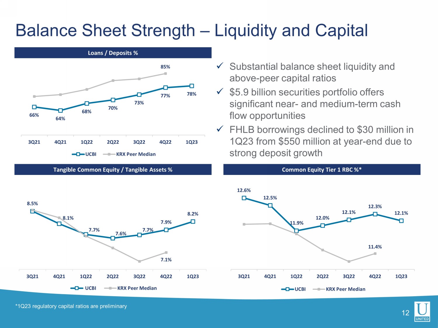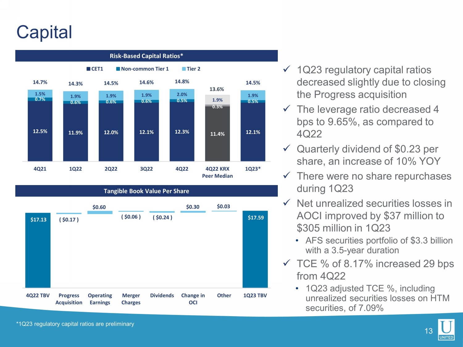 x Substantial balance sheet liquidity and above - peer capital ratios x $5.9 billion securities portfolio offers significant near - and medium - term cash flow opportunities x FHLB borrowings declined to $30 million in 1Q23 from $550 million at year - end due to strong deposit growth 8.5% 8.1% 7.7% 7.6% 7.7% 7.9% 8.2% 7.1% 3Q21 4Q21 1Q22 2Q22 3Q22 4Q22 1Q23 UCBI KRX Peer Median 12 Loans / Deposits % Tangible Common Equity / Tangible Assets % Common Equity Tier 1 RBC %* 66% 64% 68% 70% 73% 77% 78% 85% 3Q21 4Q21 1Q22 2Q22 3Q22 4Q22 1Q23 UCBI KRX Peer Median 12.6% 12.5% 11.9% 12.0% 12.1% 12.3% 12.1% 11.4% 3Q21 4Q21 1Q22 2Q22 3Q22 4Q22 1Q23 UCBI KRX Peer Median Balance Sheet Strength – Liquidity and Capital *1Q23 regulatory capital ratios are preliminary